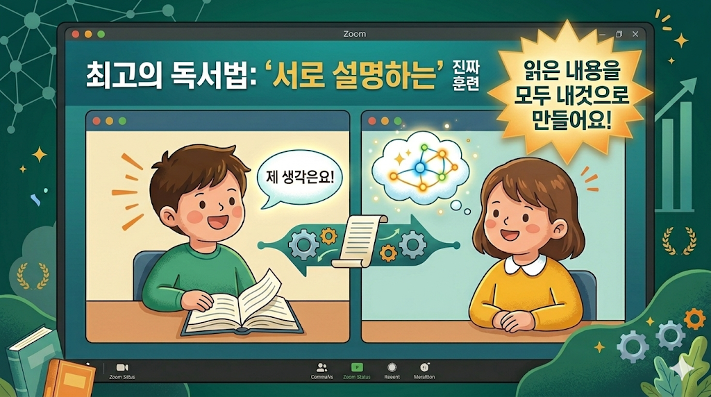 "책은 봤는데 내용은 몰라요..." 설명하는 힘을 키우면 달라집니다. 듣기만 하면 5%가 남지만, 서로 설명하면 90%가 기억됩니다. [낭독-설명-필사-발표] 4단계 루틴으로 우리 아이의 읽기 유창성과 어휘력을 탄탄하게 잡아드립니다.