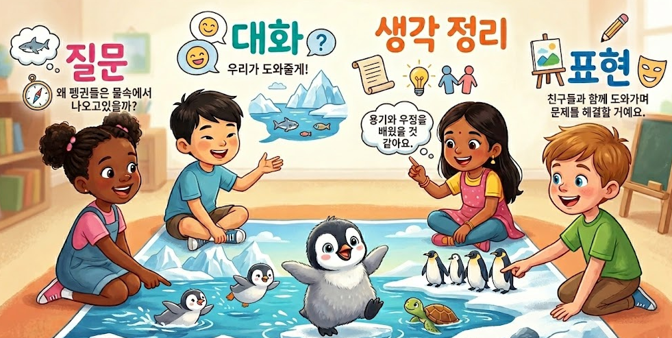그림책 「펭귄 랄랄라」를 통해 아이들이 질문하고, 말하고, 생각을 확장하는 하브루타 기반 사고력 수업입니다.