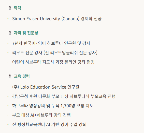 안녕하세요, 소피쌤입니다. 저는 7년차 (한국어/영어) 하브루타 연구원이자 강사이자 1700명의 학부모님의 코칭 및 하브루타 자격증 강의를 해오고 있습니다. 그림책을 통한 하브루타 질문 놀이를 통해 우리 친구들이 자신만의 스토리를 잘 표현할 줄 아는 아이가 될 수 있도록 도와 줄게요. 이스라엘의 교육 철학과 교육 방법론을 녹여 대화식 독서와 재미있는 놀이활동들로 아이들의 상상력과 창의력을 키워줄게요