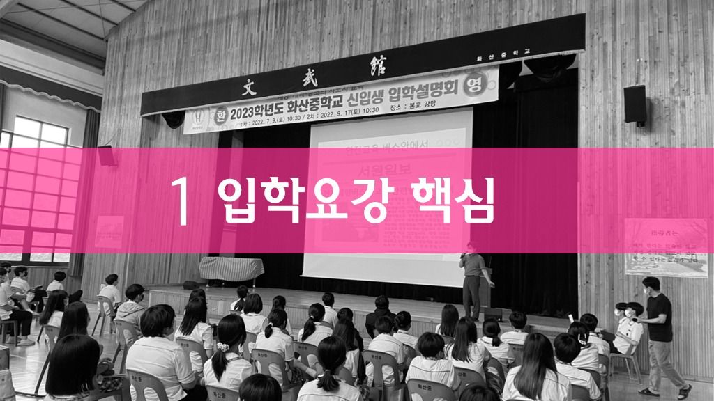 화산중의 입학요강을 먼저 정독하시고 세미나에 참석하시면 핵심 키워드 요약 내용을 좀 더 빠르게 이해하실 수 있습니다.