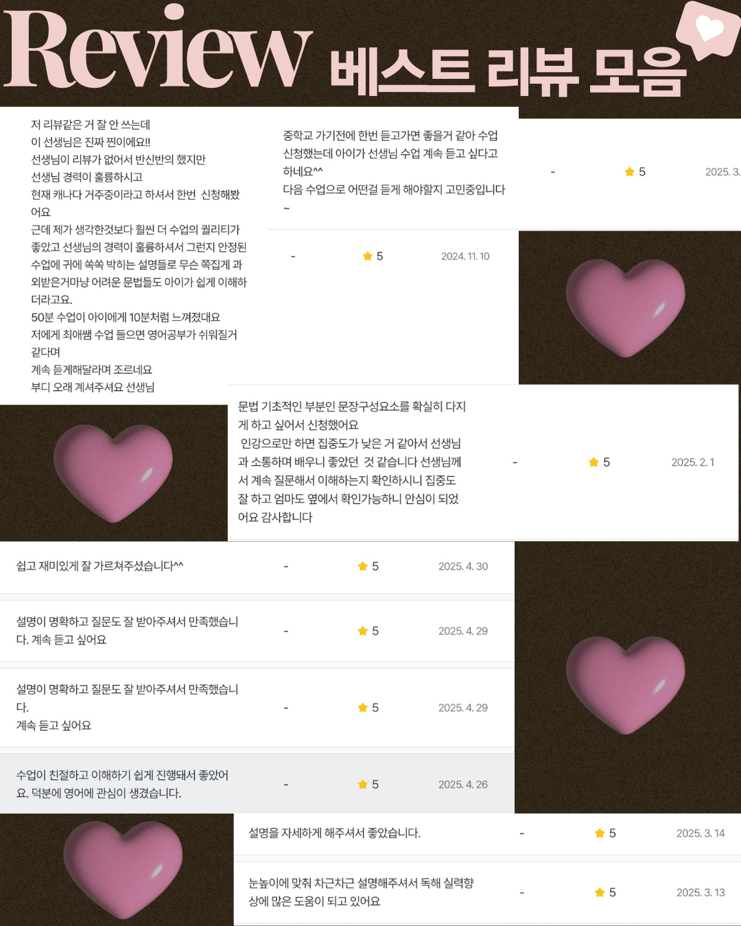 안녕하세요. 최애쌤(최예린 선생님) 입니다. - 15년이상 대형어학원 및 입시영어학원 강사 및 원장 - 초등/중등/고등/수능 입시영어 및 수능내신영어 강사 - TEPS 영문법 강사 - EBS 수능특강 내신문제집 '1시10분' 감수 및 검토자 활동 - 중고등 어휘보카책 '다보카' 감수 및 검토자 활동 - 자체교재개발 및 연구활동 -아이엘츠,듀오링고,토플 시험대비 현재 저는 캐나다에 거주하고 있으며 캐나다에서도 꾸준히 한국 초중고 학생들 대상으로 입시영어 뿐만 아니라 아이엘츠, 듀오링고, 토플영어를 가르치고 있습니다. - 어휘 / 유의어반의어 - 초중등영문법 / 수능내신영문법 / TEPS영문법 - 구문독해 / 직독직해 - 유형별 독해 - 모의고사 기출문제 풀이 -영어에세이 -아이엘츠,듀오링고,토플 등 시험대비 위의 내용으로 초등,중등,고등,성인 대상으로 다양한 수업을 오픈합니다.