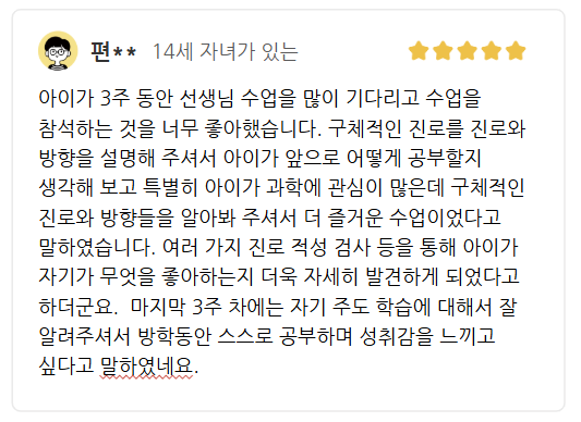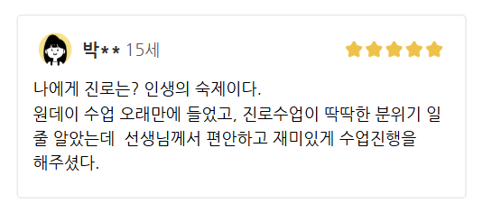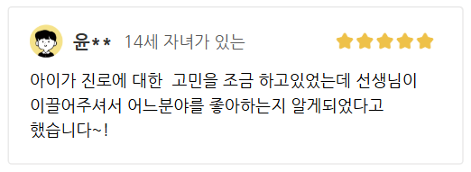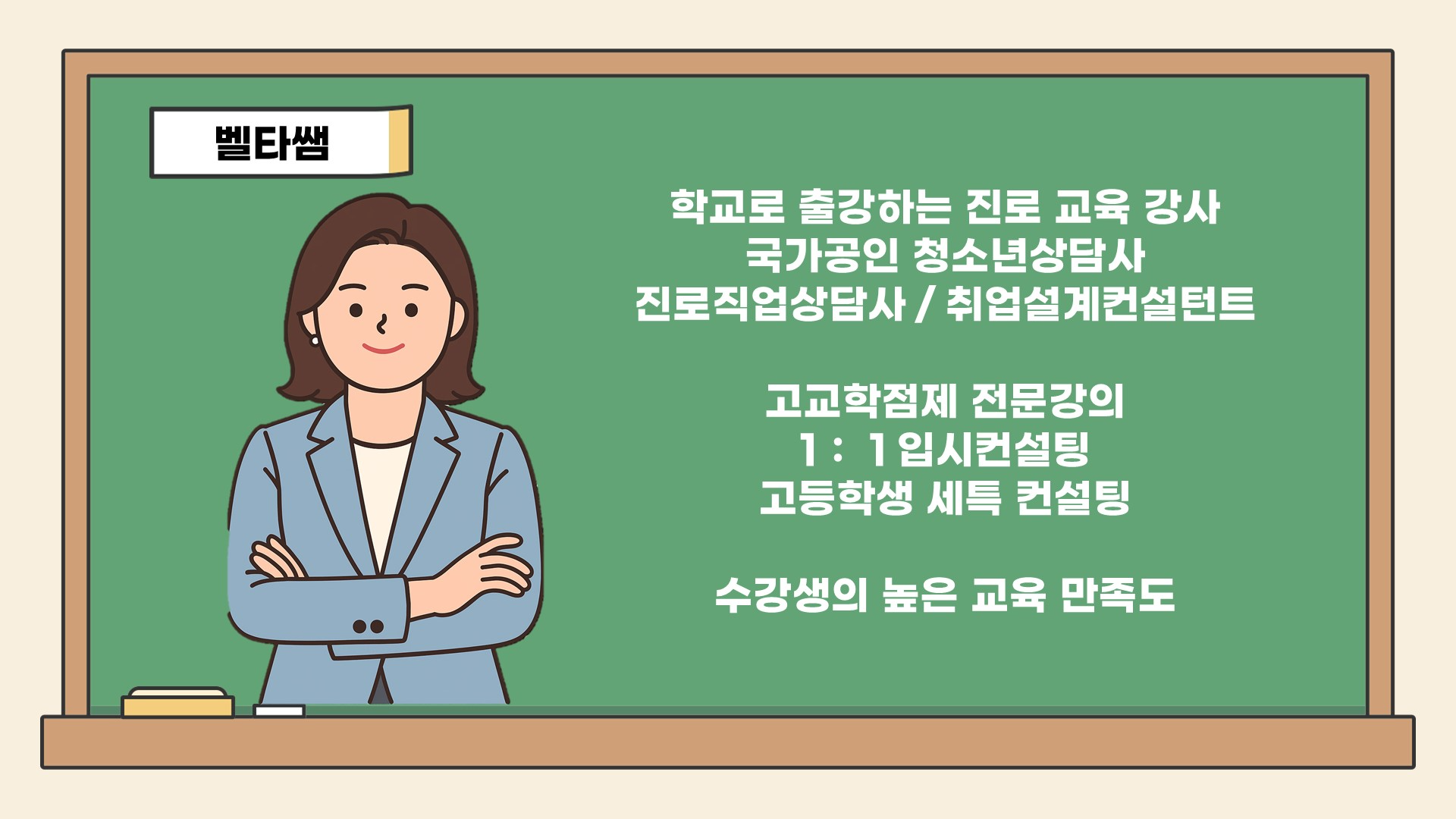 안녕하세요, 사랑으로 교육하는 벨타 강사입니다\(๑'ᵕ'๑)⸝* '나의 학생은 나의 가족'이라는 마인드로 아이가 진로의 방향성을 찾을 때까지 같이 고민하고 스스로 해결 할 수 있도록 돕는 지원가 초등학생부터 성인까지 진로 및 상담 교육을 진행하고 있습니다. 모든 수업은 듣는 일방적인 수업이 아닌 '소통형 및 상담형'으로 진행됩니다! 처음 상담을 시작하게 된 계기는 '학교 밖 청소년'을 만나고 그 친구들을 가르치면서 변화를 보게 되었습니다. 아이들에게 자신의 이야기를 진심으로 들어주는 '한 명의 어른'이 있다면, 우리 아이들이 변화 할 수 있는 내재된 힘이 있다는 것을 믿게 되었습니다. 그 후로 아이들을 사랑으로 교육하는 교육자 및 상담자가 되어야겠다고 결심했습니다. 제 수업은 아이들이 안정감을 느끼는 시간으로 자신감을 얻고 지루하지 않고 재미를 통해 많은 것을 얻어 갈 수 있습니다. 고교학점제부터 2022 교육개정안으로 입시제도가 변하였습니다. 아이들의 진로 방향성 설계는 중요한 요소가 되었으며, 자신이 좋아하는 것을 찾아 일 할 때 큰 보람을 느끼는 것을 알 수 있습니다. 두렵고 외롭고 무서운 진로의 길, 내가 부족한 것이 아닌지 스스로에 대해 자주 실망하는 아이들이 이제 더 이상 낙담하지 않고 지치지 않도록 이제 다양한 진로 및 상담 수업을 통해 변화하고 성장해보세요! 그 길에 누구보다 진심으로 응원하는 제가 함께 하겠습니다. - 상담 전공자인 청소년상담사 - 전국 초중고등학교 학교 현장교육 5년 - 온라인 직업체험 교육 강의 경력 - 1:1 입시컨설팅 경력 - 만족도 높은 교육 수강 후기 * 자격증 - 청소년 상담사 - 청소년 안전지도사 - 상담교육사 - 진로직업상담사 - 취업설계컨설턴트 수업 전 메세지를 통해 보호자님과 소통하고 있으니 메세지 확인 부탁드립니다🥰