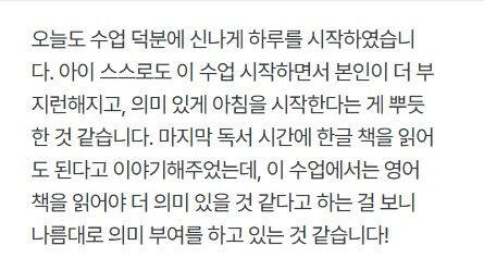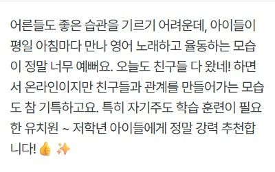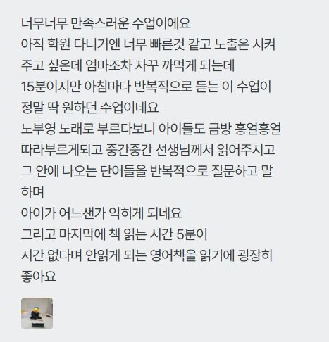 ⏰ 등교 전 15분 영어 + 10분 독서⏰ 노래로 영어 뇌를 깨우는 가장 쉬운 방법 “15분 영어 노래 + 10분 모닝독서” 루틴으로 하루가 달라져요! “늦잠 자던 아이가 먼저 일어나서 수업을 기다려요” 라는 후기가 증명합니다. 영어 뇌를 깨우는 15분 후에는 각자 책을 읽으며 독서 습관까지 키우고 있습니다. 우리 아이의 영어를 위한 “아침 루틴으로 최고의 선택” 지금 시작해보세요!