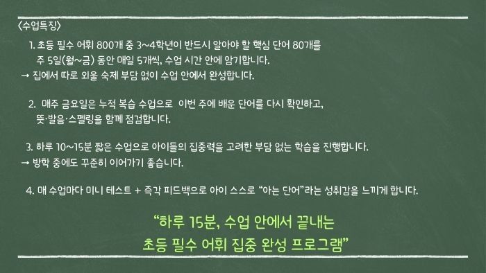 ‘외워라, 써라’는 방식이 아니라, 친구들과 그림도 보고, 게임도 하면서 저절로 단어 뜻이 머릿속에 자리 잡아요. 수업에서 직접 미니 테스트도 해보고, 금요일마다 실력 확인까지 하니까 방학만 끝나면 단어 걱정 없이 자신감이 쑥쑥 자라나요!