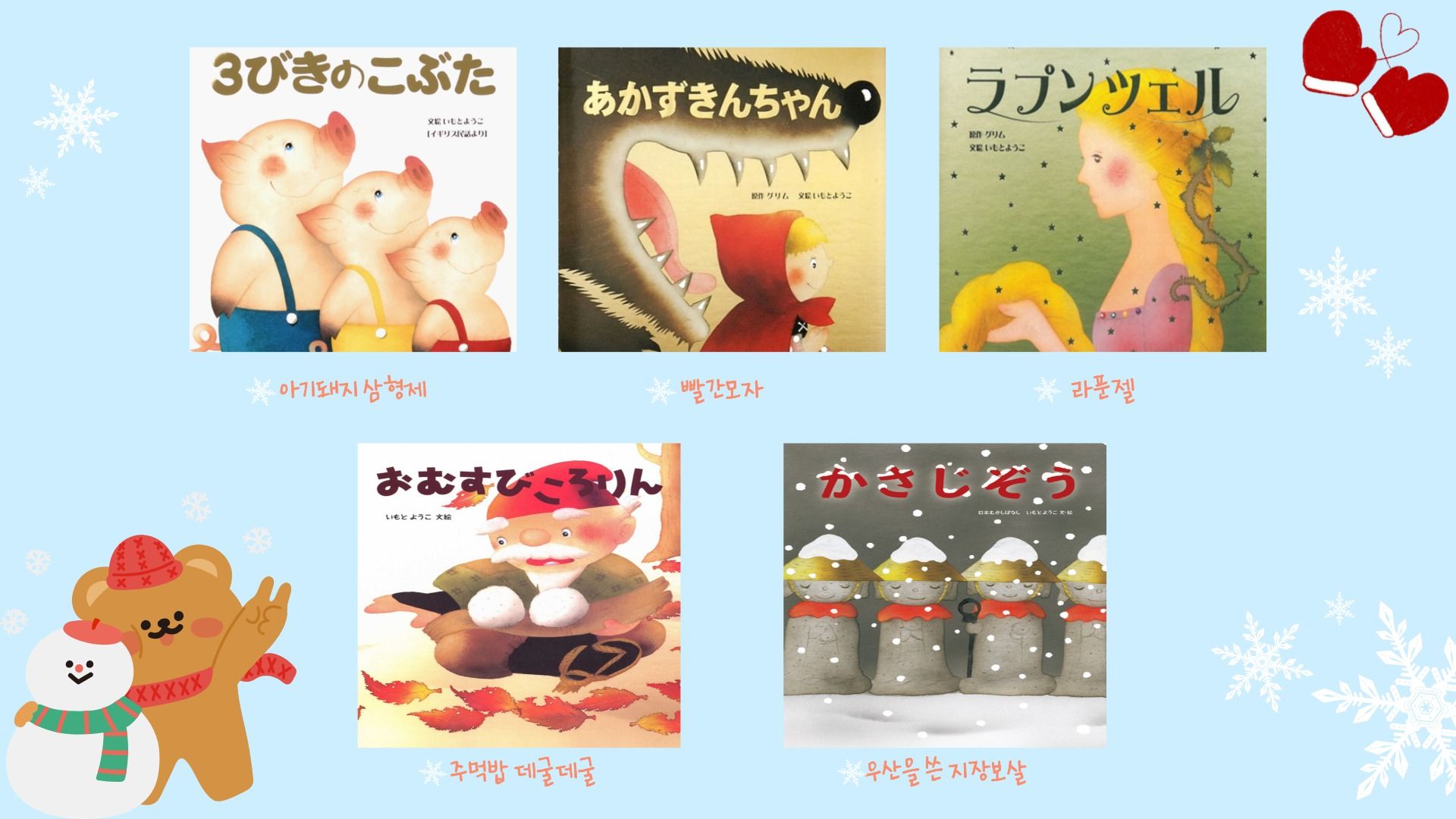 아기돼지 삼형제 / 주먹밥 데굴데굴 / 라푼젤 / 빨간모자 / 우산을 쓴 지장보살