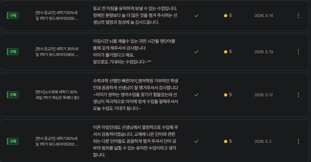 이 수업은 짧은 시간이지만 매일 꾸준히 단어를 접할 수 있게 도와줘요. 그날 배운 단어를 곧바로 점검하며, 일정 기간마다 단계적으로 실력을 쌓다 보면 자연스럽게 영어 단어가 생활 속에 스며들 거예요. “외우고 잊어버리는” 반복에서 벗어나, 실천하는 단어 암기 습관을 경험해보세요!