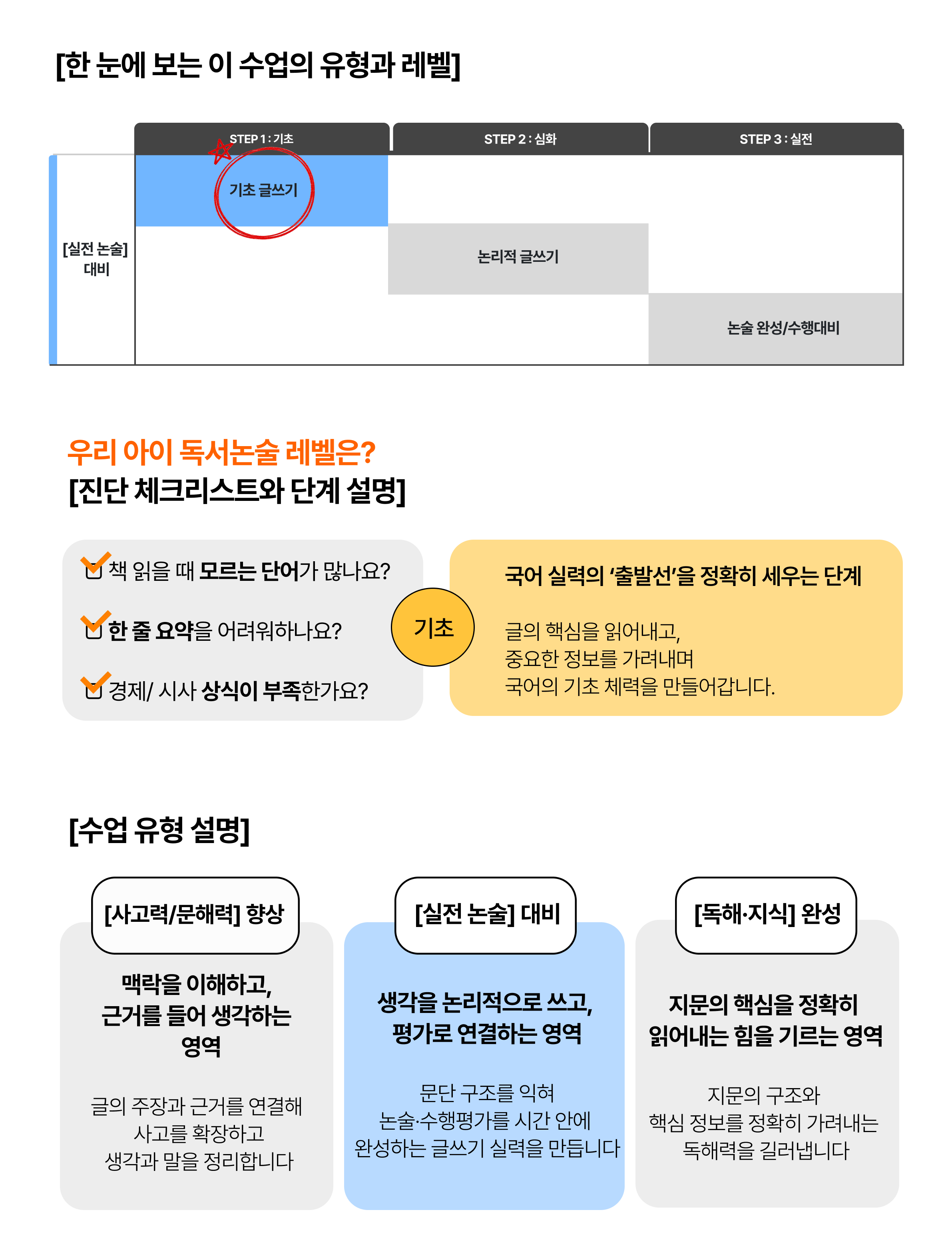 주장·근거·정리가 분명한 글의 기본 틀을 반복 연습합니다.