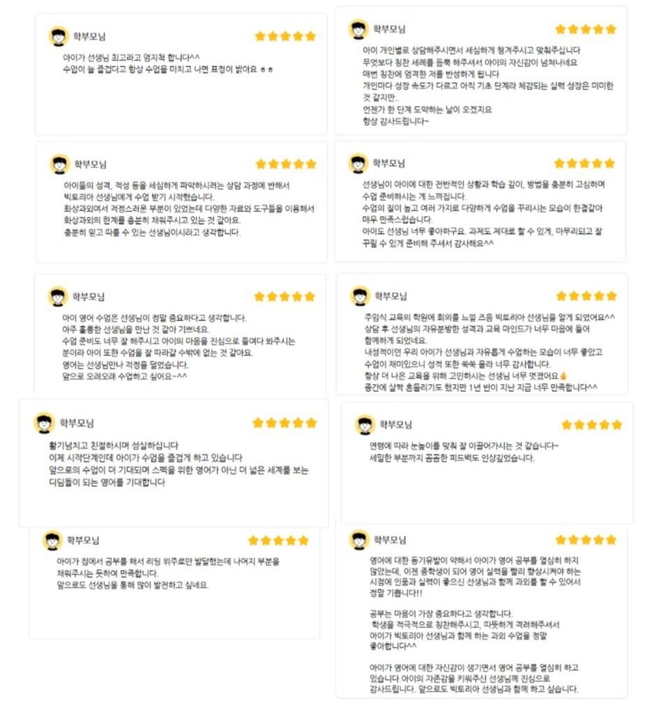 🇬🇧 영어 강사 경력 9년 차 🇬🇧 [석사] The University of Manchester (세계27위) 비지니스 스쿨 최우수 등급 졸업 🇬🇧 [학사] Coventry University 최우수 등급 졸업 🇬🇧 (전) The University of Manchester 비지니스스쿨 홍보대사 & 석사 대표 블로거 🇬🇧 (전) The University of Manchester 온라인 국제 세미나 페널리스트 🇰🇷 (전) 한국 최대 아이엘츠 커뮤니티 아독사 멘토 *합격 및 지도 사례: 고려대학교, 브랭섬홀 아시아, GIA 국제학교, JIS 국제학교, ISL 카타르 국제학교, 칭화대학교 (세계 20위), 대원국제중, 용인외대부고, 울산외고, 주재원 자녀, 외교관 자녀 등 다수 * 영재 홈스쿨링: 음악 (바이올린, 첼로 등), 무용, 예원학교, 국악고, 연예인 준비생 등 ---------------- 안녕하세요, 전문 영어 강사 김빅토리아입니다! 세계 27위 영국 명문대 맨체스터 비지니스 스쿨에서 석사 졸업 후 한국인 학생 분들 대상으로 영어 수업을 제공하고 있습니다. 특히나 한국에서 수 년간 학교와 학원을 다녀도 스피킹 실력이 늘지 않는 학생 분들의 사례들을 통해 이에 특화된 커리큘럼을 진행하고 있습니다. 실제로 한국 혹은 국외에 거주하는 학생분들이 영어를 단어만 따로 따로 내뱉는 수준에서 회화가 가능한 수준을 달성 하시도록 가이드 해드림으로써 만족도가 매우 높은 수업을 제공하고 있습니다. 수업 희망 시 편하게 문의주세요!