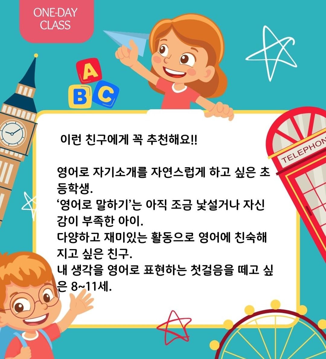 나만의 네임카드를 영어로 만들어보기! 100% 영어 수업으로 영어 공부에 대한 친화력을 높이고 다른 친구에게 스스로를 재밌게 소개할 수 있는 나만의 네임카드를 만드는 수업입니다. 영어에 대한 자신감을 UP 시켜드려요!