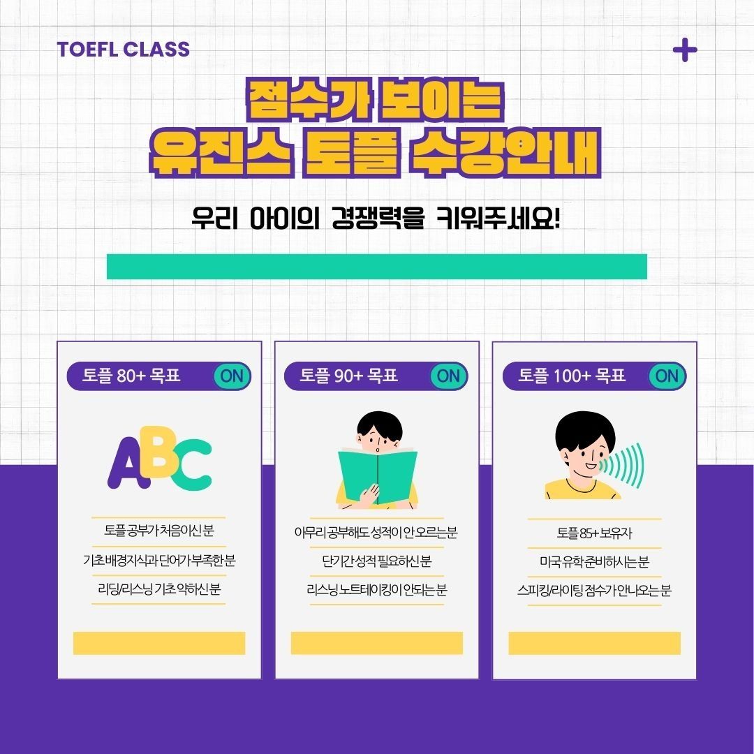 우리 아이 토플 공부, 아직도 시작하지 않으셨나요? 앞서가는 영어 실력을 위해서 토플 점수는 필수적입니다. 18년 동안 국제학교 학생들 및 성인들까지! 유학을 준비하는 수없이 많은 학생들에게 토플을 가르친 노하우를 집약한 '유진스 토플 스타터'와 함께 준비해보세요!