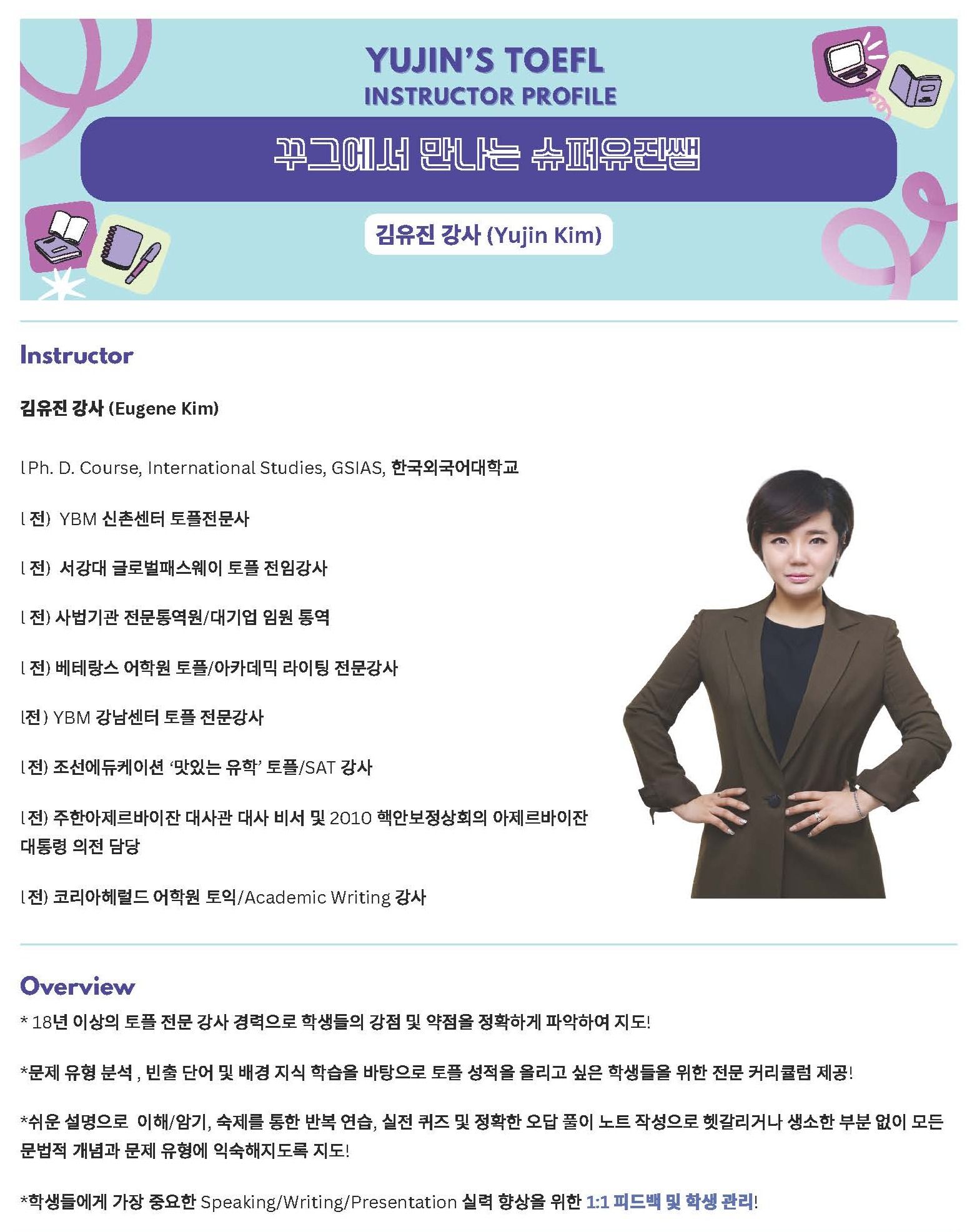 "영어는 영어 전문강사에게 배우세요!" 안녕하세요! 영어전문 강사 유진쌤입니다! 전 18년 이상 영어강사, 전문 통번역가 및 해외 업무에 종사한 경험으로, 현재 신촌 YBM과 서강대 Global Passway에서 토플을 가르치고 있습니다. 또한, 국내외 국제학교 학생들을 대상으로 TOEFL, academic writing 및 interview 수업을 하고 있습니다. 호주 교포 출신이며 영어를 전공했고 한국외국어대학교 GSIAS에서 북미정치학 석사를 졸업했고 현재 동대학원에서 박사과정에 있습니다. 주한 아제르바이잔대사관 대사 비서, 대기업 임원 통역 및 해외 방송 사업관련 업무 역임, 전문 기업 통번역사, 사법통역사 및 YBM어학원/전국대학교/조선 에듀케이션/코리아헤럴드 등에서 토익/토플 전문강사로 일했습니다. 탄탄한 영어 지식과 경험으로 학생들의 실력에 맞는 최적화 된 수업을 구상하고 국제화 사회에서 성공할 수 있는 영어 인재로 키우고 싶으시죠? 아이들이 영어를 싫어하나요? 지겹고 귀찮은 영어 수업이 아니라 학생들이 직접 참여하고 적극적으로 활용할 수 있는 영어 수업으로 다가가겠습니다!