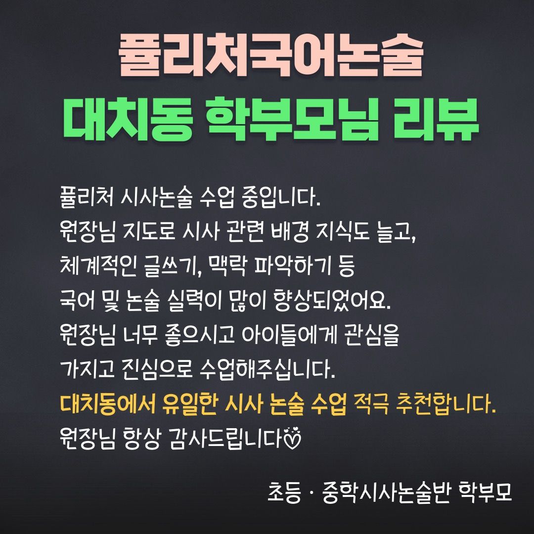 "국어 유목민으로 여러 학원 찾아다녔는데, 퓰리처 수업이 바로 지금까지 찾던 그 수업이에요!" 라는 것입니다.