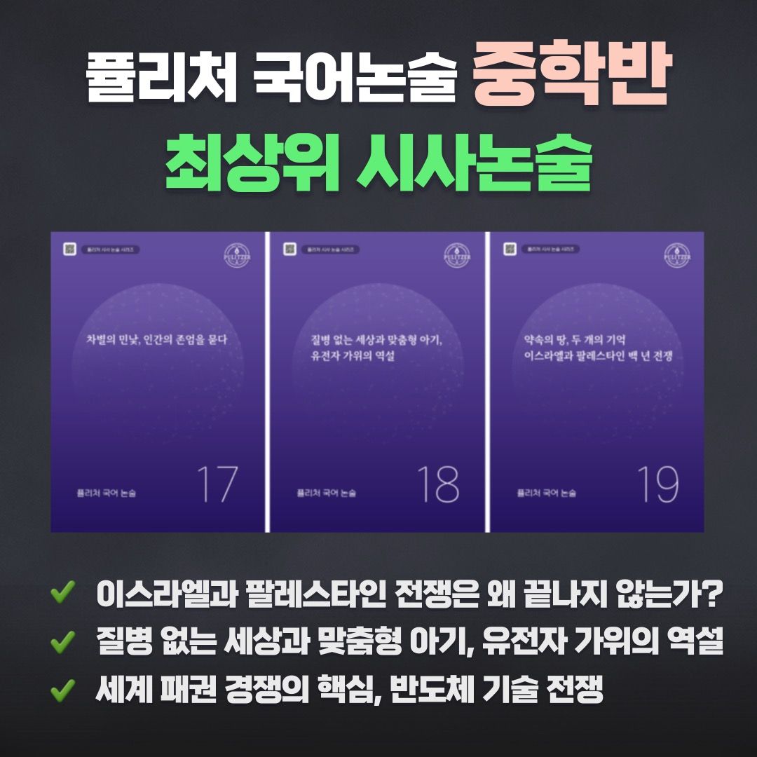 <퓰리처 중학시사논술>에서는 세계 이슈, 역사‧과학‧경제‧의학 등 다양한 분야의 흥미로운 주제를 다루면서 글의 핵심을 파악하고 논리적으로 생각하는 연습을 합니다. 단순히 아는 것을 나열하는 것이 아니라 글의 논리적 구조를 직접 설계하고 전개해봄으로써 독해력과 논리력 뿐 아니라 자기 표현력까지 폭넓게 성장할 수 있게 됩니다. 중학을 뛰어넘어 고등까지 ‘국어의 힘’을 키우고 싶다면 지금 <퓰리처 중학시사논술>과 함께 시작해 보세요!