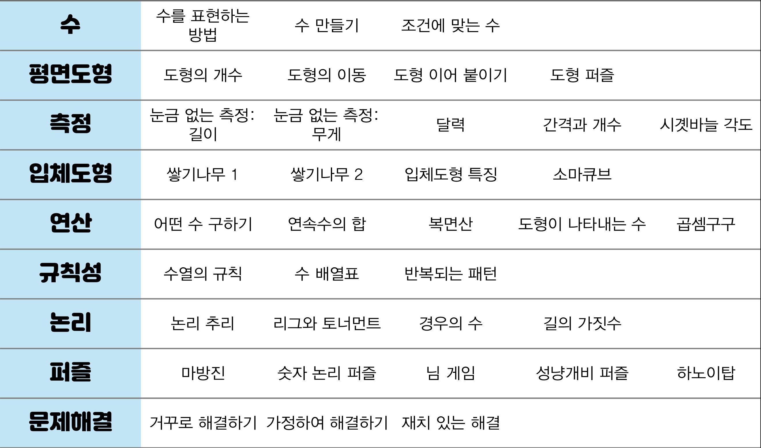 비교, 관찰, 분류, 배열, 측정, 도형 조작 등 다양한 활동으로 주제를 만납니다.