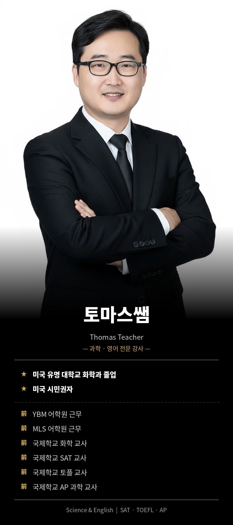 영어가 입시의 높은 벽처럼 느껴지나요? 만 20년간 현장에서 중등 내신부터 수능 1등급까지 수많은 학생의 성장을 이끌어온 *토마스쌤(Thomas)*이 딱딱하고 지루한 문법의 틀을 깨뜨려 드립니다. 미국 시민권자이자 국제학교 과학교사 출신의 독보적인 전문성으로, 영어를 보는 새로운 시각을 선물합니다.