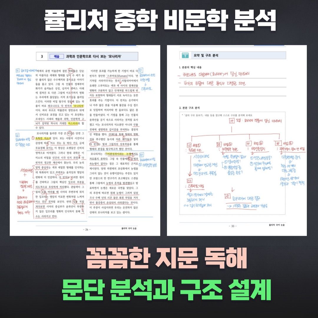 <퓰리처 중학 비문학 독해> 수업은 자체 개발한 교재를 바탕으로 국어 지문을 내용별로 정확히 나누고 핵심 내용을 찾아내 글의 구조도를 작성하는 수업을 진행하고 있습니다.