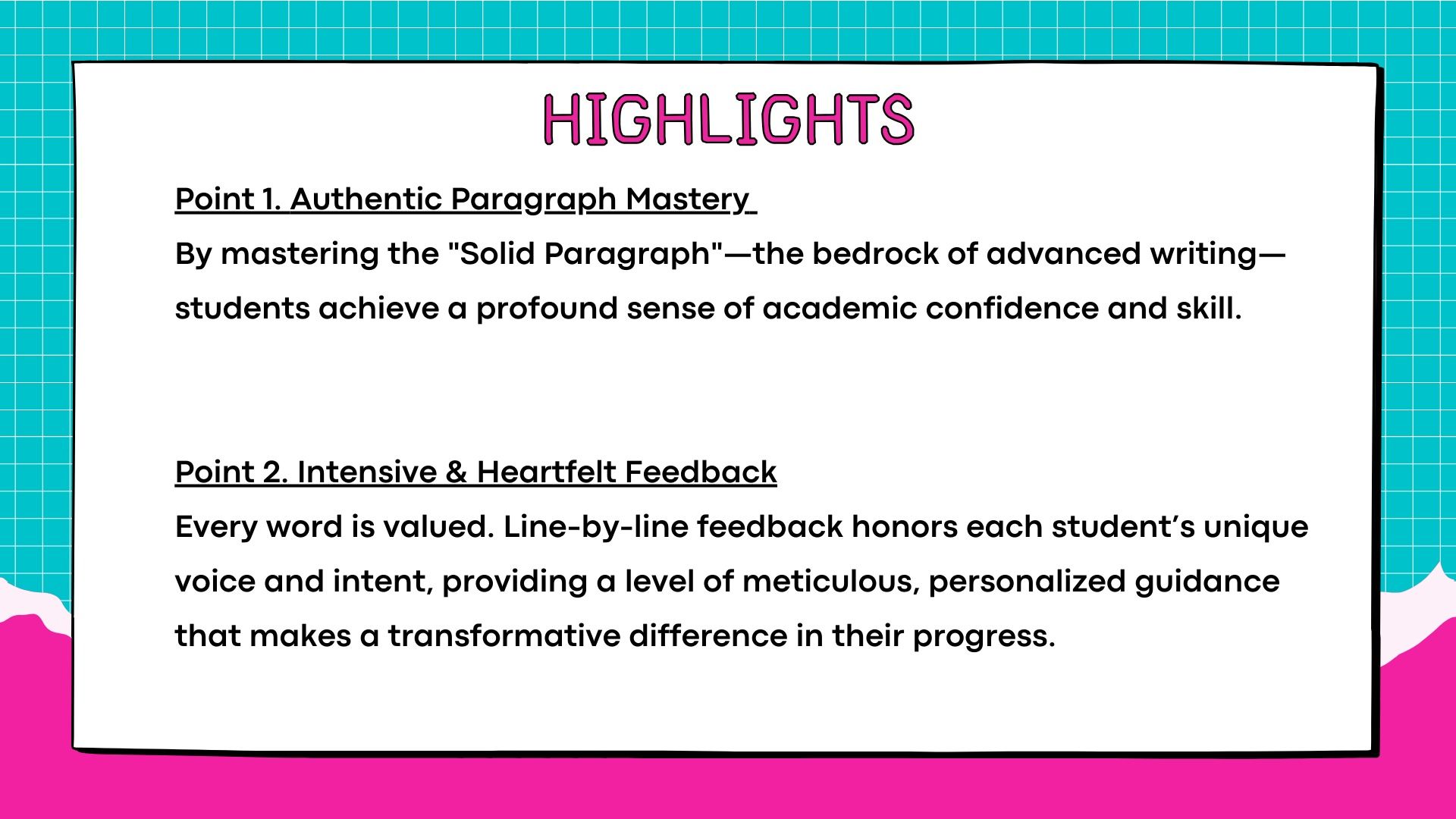 Every word is valued. Line-by-line feedback honors each student’s unique voice and intent, providing a level of meticulous, personalized guidance that makes a transformative difference in their progress.