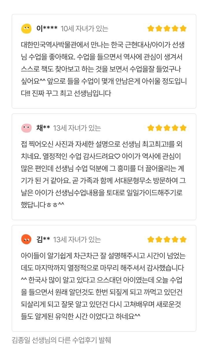 안녕하세요, 종일쌤 입니다. 15년 동안 2,000회가 넘는 수업을 하며 초등학생부터 중고등학생 친구들까지 수많은 아이들과 함께 역사를 이야기해왔습니다. 그 과정에서 한 가지 확신이 생겼습니다. 시험을 위한 역사는 어렵고 지루하지만, 이야기로 만나는 역사는 아이들의 눈을 반짝이게 만든다는 것. 제가 하는 수업은 책 속에 갇힌 역사 지식을 꺼내 현장과 이야기, 상상력으로 연결하는 살아있는 수업입니다. “왜 그랬을까?” “그다음엔 무슨 일이 있었을까?” 이런 질문이 이어질 때, 아이들의 머릿속에 역사는 하나의 ‘드라마’로 남습니다. 📚교과서를 기반으로 하지만, 단순한 요약은 하지 않습니다. 🎬시대마다의 갈등, 선택, 변화의 흐름을 마치 시간여행처럼 따라가는 주제별 스토리텔링 수업을 만듭니다. 아이들이 스스로 “왜?”를 묻고, 과거의 인물과 함께 그 시대를 걸어보게 하는 수업. 저는 그런 방식으로 역사를 전하고 싶습니다.
