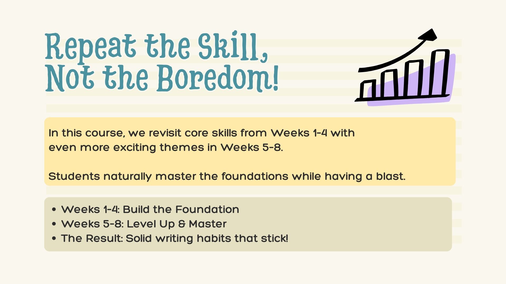 We revisit core writing goals from Weeks 1–4 with even more engaging and creative themes in Weeks 5–8.