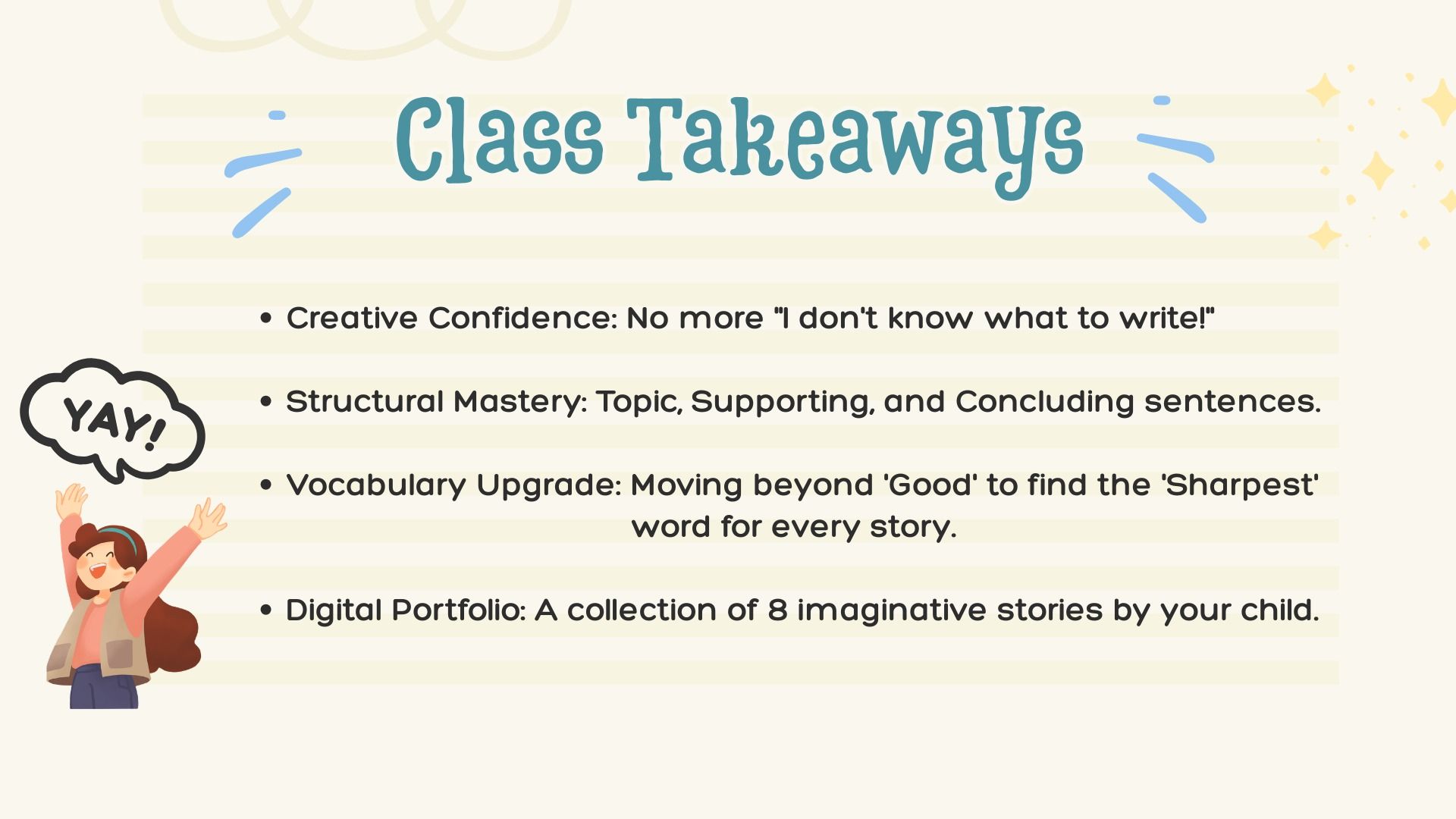 A dynamic 8-week writing workshop where students unleash their imagination through fun, creative stories while cultivating a sharp, authentic voice.