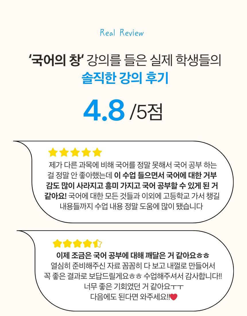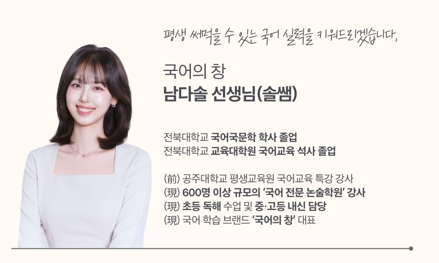 안녕하세요, 읽고 쓰면 인생이 변한다! 국어의 창 솔쌤입니다.😊 🏫국문학을 전공하고 국어교육학 석사 과정을 마쳤으며, 2급 정교사 자격증을 보유하고 있습니다. 현재 400명 이상이 수강 중인 대형 국어 전문 학원에서 출강하며, 내신과 국어 기본기 지도에 집중하고 있습니다. 👩🏻🏫또한 인스타그램 ‘국어의 창’ 계정을 통해 약 2만명의 학생, 학부모님과 소통하며 현장에서 바로 적용할 수 있는 국어 공부 방법과 학습 전략을 꾸준히 전달하고 있습니다. 국어가 어렵게 느껴졌다면, 이번 수업을 통해 국어를 바라보는 시선부터 함께 바꿔보세요.