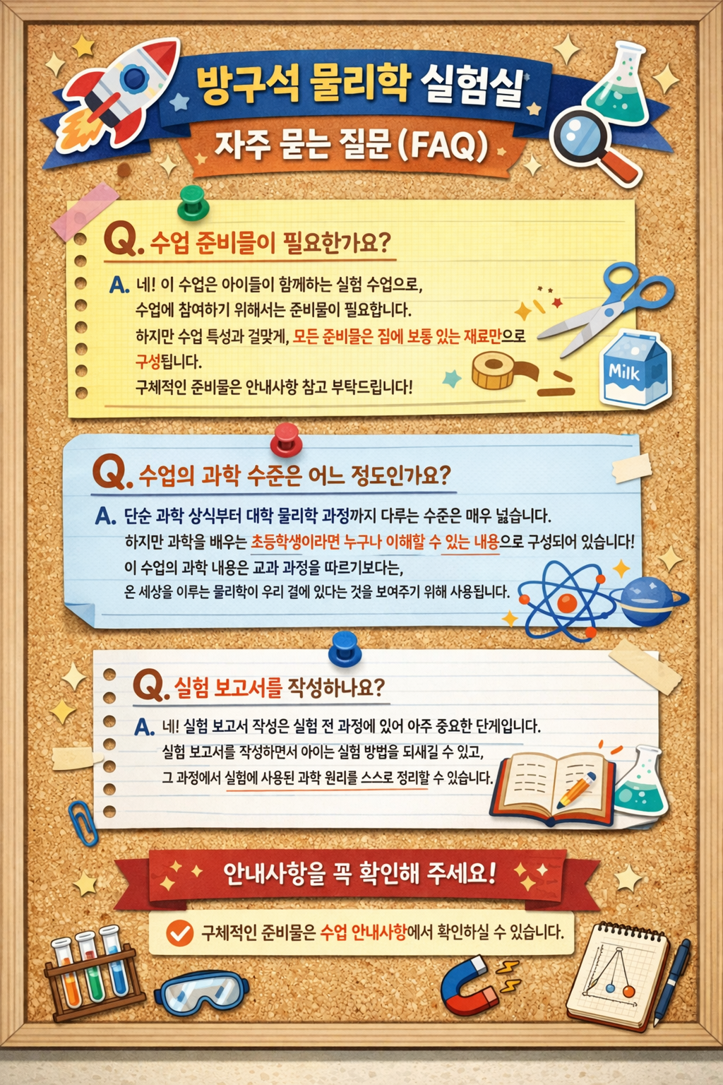 [방구석 물리학 실험실]은 집에 있는 재료만으로 직접 물리학 실험을 경험하며, 일상 속 물리 개념부터 기초 이론까지 쉽고 재미있게 이해할 수 있는 수업입니다. 실험을 통해 얻은 결과를 정리해 나만의 물리학 보고서를 완성하고, 이를 바탕으로 세상을 물리학적으로 바라보는 사고력과 관찰력을 자연스럽게 기를 수 있습니다.