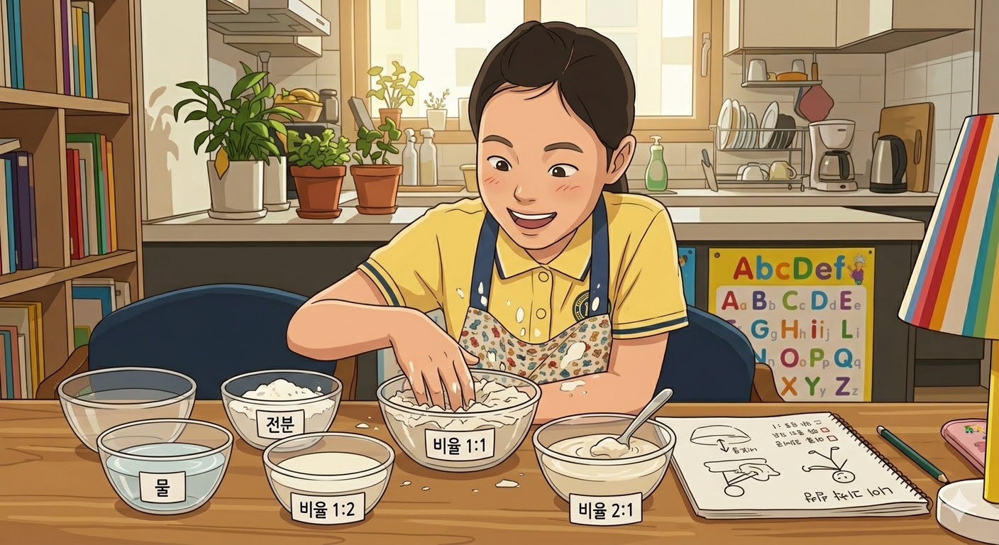 전분과 물의 비율에 따라 나타나는 비뉴턴 유체의 특성을 실험합니다. - 교과연계 : 초등 5~6학년 과학 – 물질의 성질과 혼합물