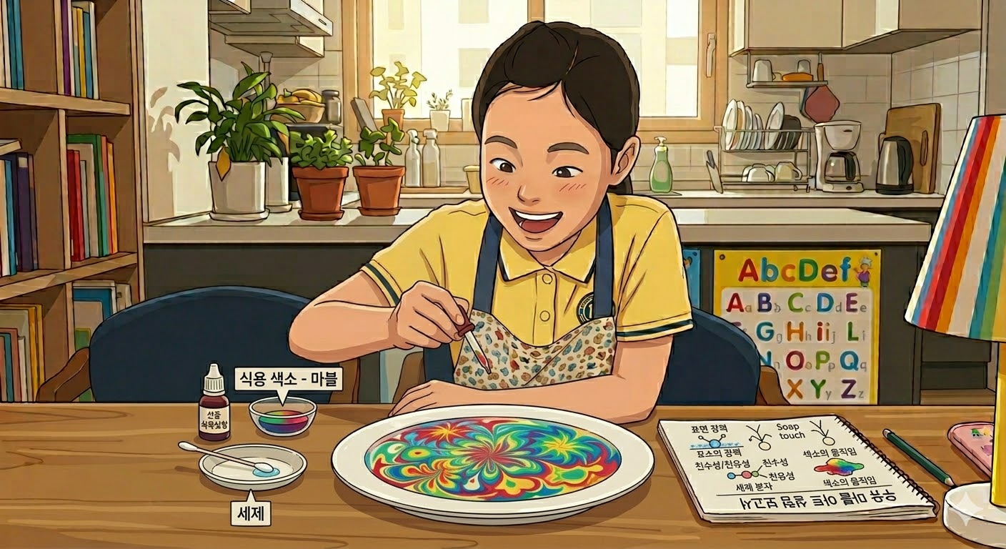 우유 위에 색소와 세제를 떨어뜨려 표면 장력에 따른 움직임을 실험합니다. - 교과연계 : 초등 5~6학년 과학 – 물질의 성질 단원 (표면 장력)