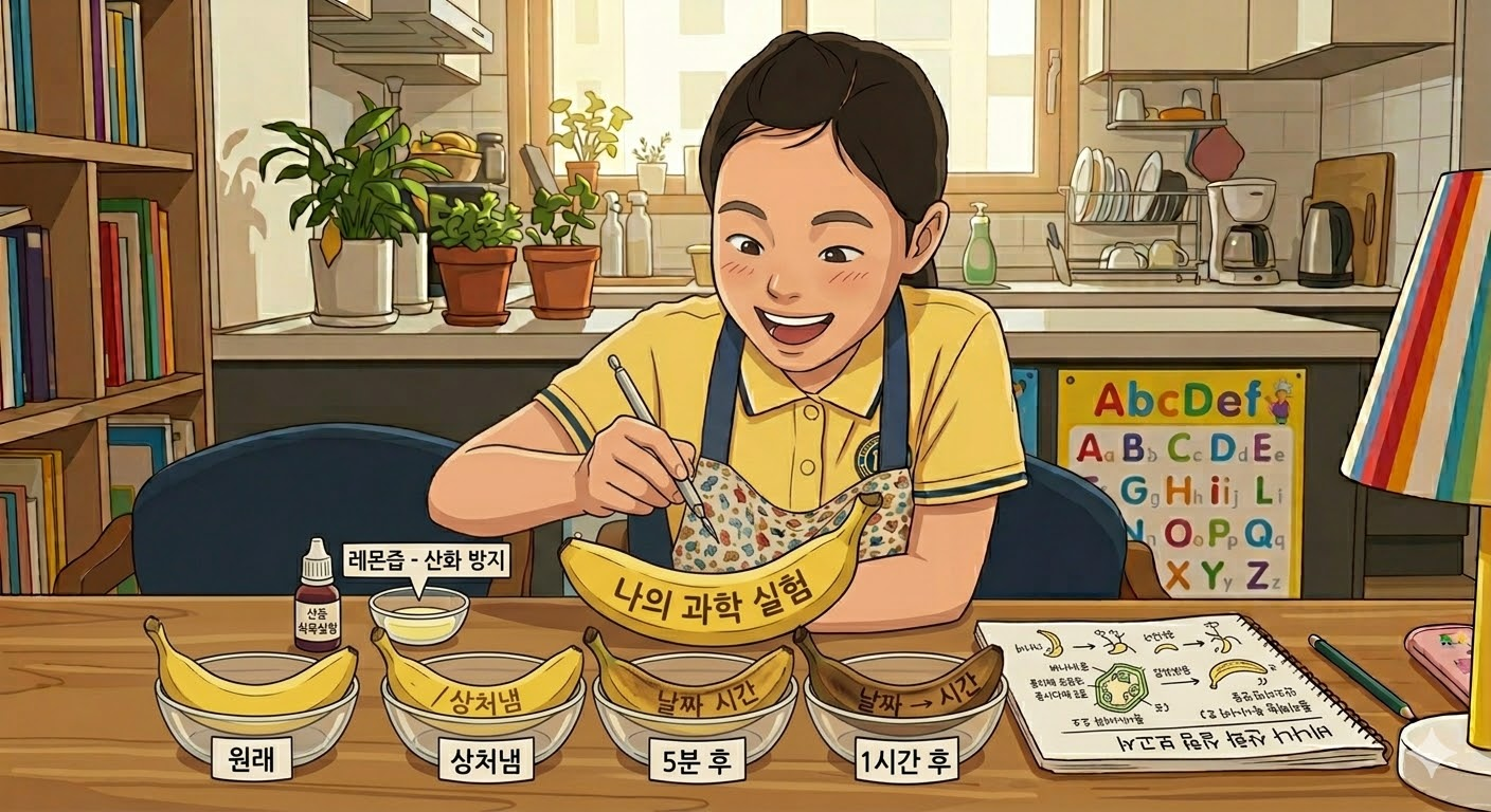 바나나 표면의 산화 반응을 활용해 글씨를 쓰며 산화 원리를 실험합니다. - 교과연계 : 초등 5~6학년 과학 – 물질의 변화
