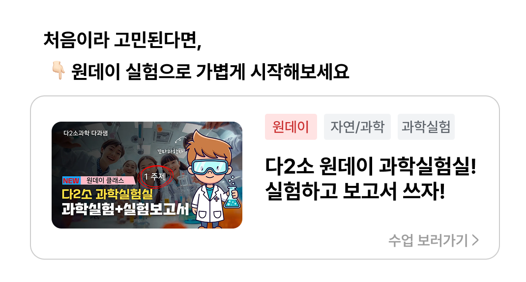 기존 다2소과학 3탄 과학실험에서 핵심적인 실험 4주제를 뽑아서, 실험하고 보고서 작성까지 합니다. 먹을까? 실험할까? 식품 속 재료로 과학적 사고력과 탐구심을 키우는 특별한 클래스!