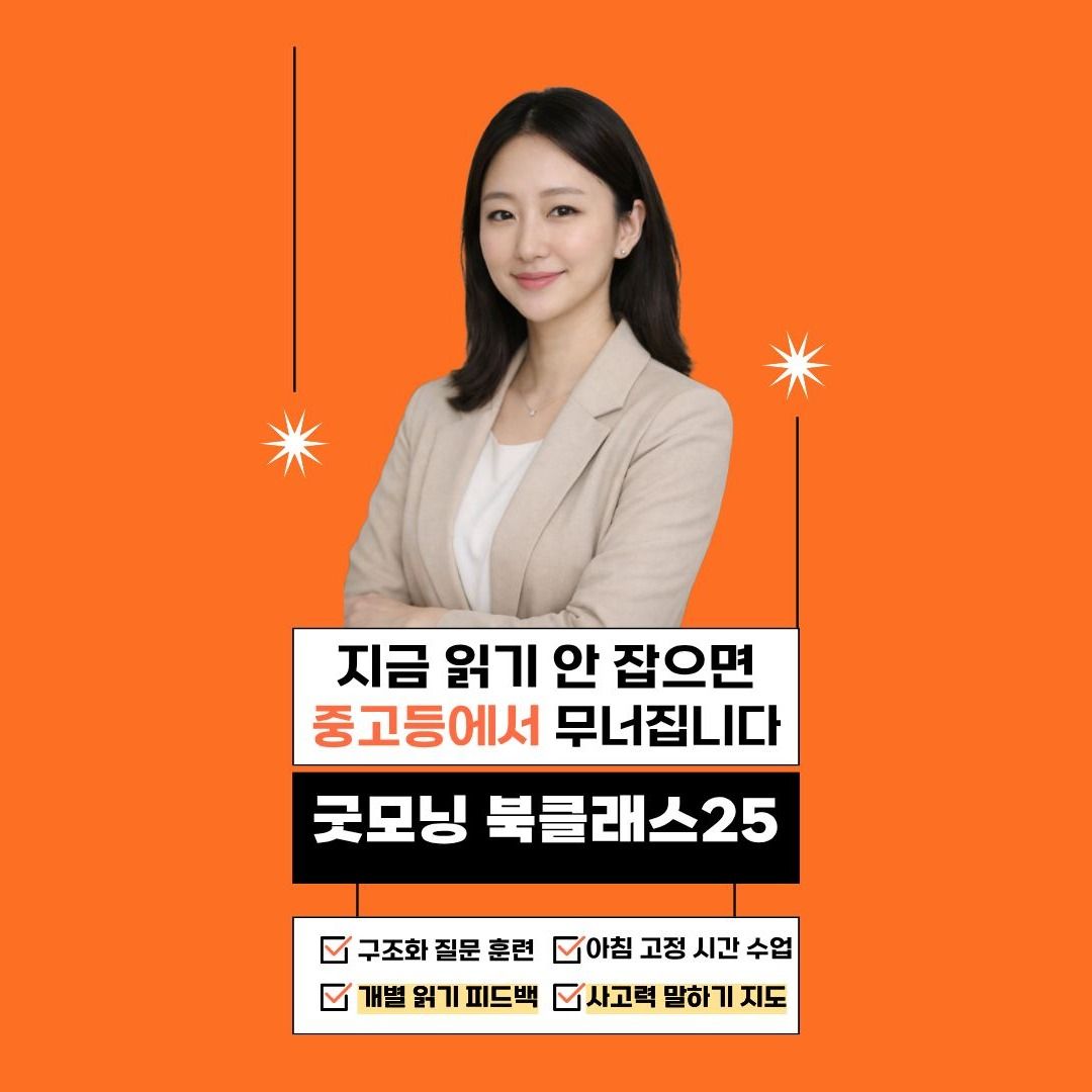 초등 사고력이 흔들리면 중고등 공부도 어려워집니다. 아침 25분 북클래스 루틴 수업으로 읽기·이해·생각 말하기까지 훈련하고 피드백으로 자기주도 학습 습관을 만듭니다.