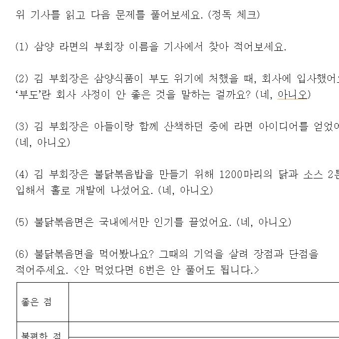 수업에서는 먼저 라면과 관련된 기사를 함께 읽으며 핵심 내용을 살펴봅니다.