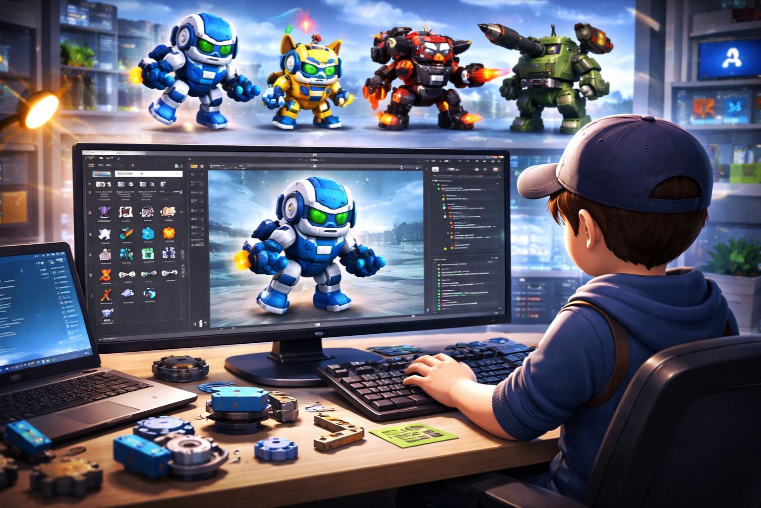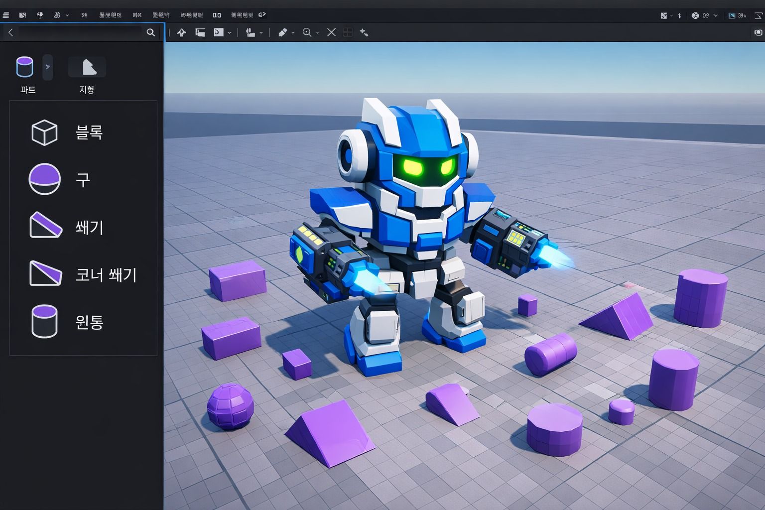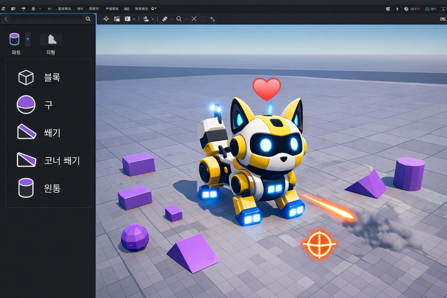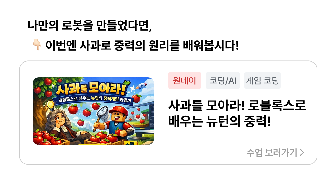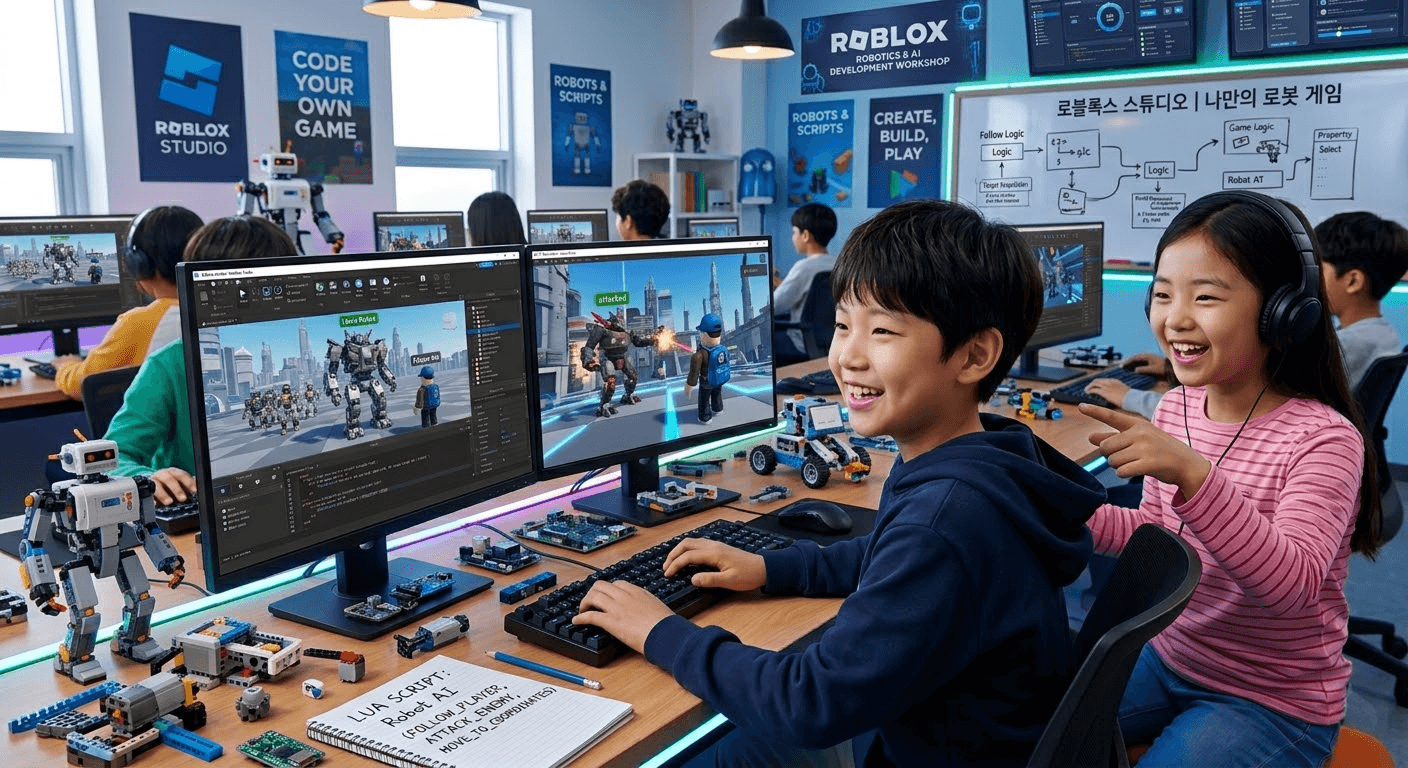 나만의 로봇을 직접 만들고, 나를 따라다니게 하며 공격 기능까지 구현해 하나의 게임을 완성하는 수업입니다. 로블록스 스튜디오를 활용해 코딩과 게임 제작을 배우고 친구들과 함께 플레이합니다.