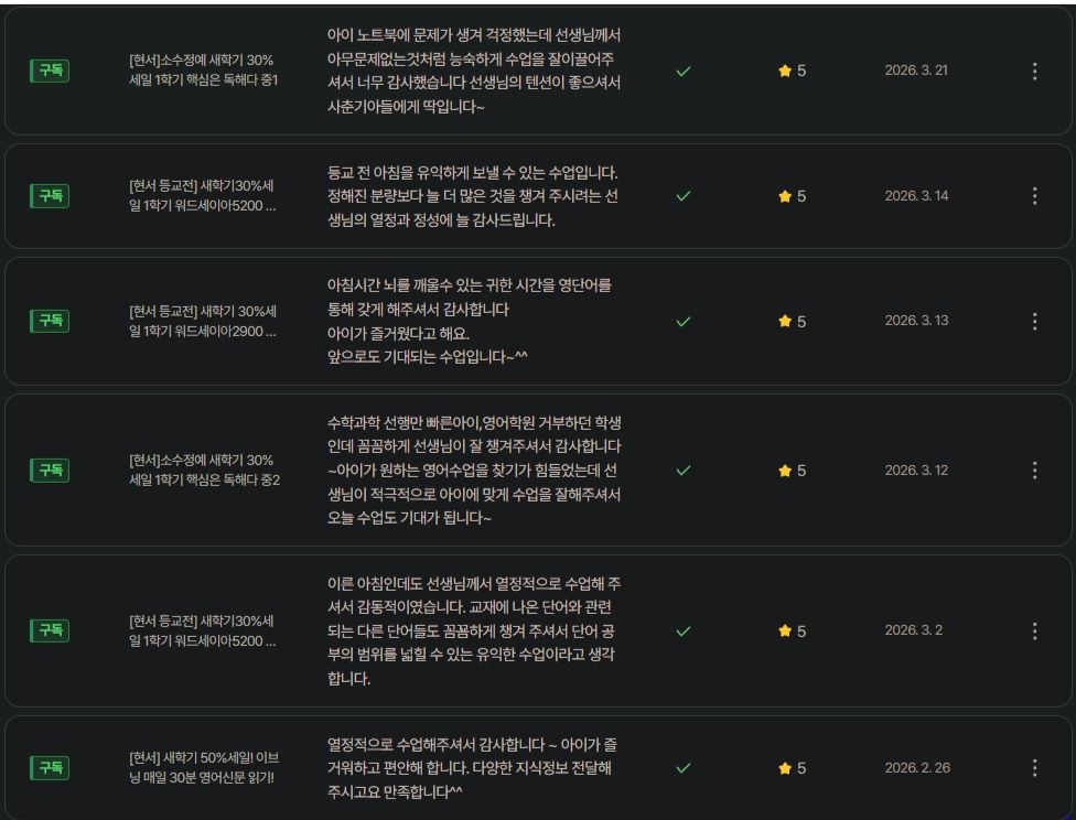 꾸그 유일 20대 중등/고등 스타 썜입니다!. 10년을 함께 할 선생님입니다!. 💬 “아이의 마음을 아는 선생님인가요?” 저는 단언합니다 👉 누구보다 학생을 먼저 생각합니다 단순히 가르치는 것이 아니라 👉 “아이 한 명의 인생 방향을 바꾼다”는 마음으로 수업합니다 🔥 저는 ‘잘했던 학생’이 아닙니다 👉 저는 지방 일반고 고3 12월, 9등급 꼴찌 이었습니다 👉 그 상태에서 ✔ 서강대학교 입학 ✔ 한국외국어대학교 합격 💡 그래서 압니다 ✔ 공부가 안 되는 이유 ✔ 어디서 무너지는지 ✔ 어떻게 다시 올라가는지 👉 꼴찌의 마음도 알고 상위권의 사고도 아는 선생님입니다 ❗ 이런 생각, 해보신 적 있으신가요? 👉 “잘해본 선생님이 우리 아이를 정말 이해할 수 있을까?” ✔ 처음부터 잘했던 사람은 👉 못해본 경험이 없습니다 ✔ 하지만 저는 👉 막힘 → 실패 → 극복 → 결과 👉 이 모든 과정을 직접 겪었습니다 💡 그래서 가능합니다 👉 “공감이 아닌, 경험 기반 지도” 👩🏫 검증된 선생님 🎓 서강대학교 유럽문화학과 ✔ 중·고등 영어 7년 이상 지도 ✔ 꾸그 중학 영어 스타 / 고등 영어 스타 ✔ 중1 ~ 고3 전 영역 (내신 + 정시) 전문 👉 꾸그 유일 고3까지 전영역 지도 👑 결과로 증명합니다 고3: 5등급 → 2등급 (6개월) 고1: 5등급 → 1등급 고3: 7등급 → 수능 3등급 중3: 42점 → 82점 (40점 상승) 중3: 70점대 → 80후반 전원 탈락 → 한양대 합격 현재 학생들 전부 성적향상. 👉 “방법이 바뀌면 성적은 반드시 올라갑니다” 🎯 제 수업의 목표는 단 하나입니다 👉 “원하는 학교에 보내는 것” 저는 대구에서 태어나 경산이라는 작은 도시에서 자랐습니다 ✔ 정보 부족 ✔ 환경의 한계 ✔ 비교 대상 부족 👉 그 상황을 누구보다 잘 압니다 그래서 더 집중합니다 👉 지금 이 아이에게 필요한 것만 정확히 가르칩니다 ⚡ 제 수업이 다른 이유 👉 저는 ✔ 꼴찌도 가르쳐봤고 ✔ 상위권도 만들어봤습니다 그래서 👉 “어디서 시작하든 끝까지 끌고 갈 수 있습니다” 💡 제가 약속드리는 것 ✔ 아이를 절대 포기하지 않습니다 ✔ 아이 수준에 맞춰 끝까지 책임집니다 ✔ 결과가 나올 때까지 방향을 잡아줍니다 👉 “수업만 하는 선생님”이 아니라 👉 “결과까지 책임지는 선생님”입니다 🚀 마지막으로 드리고 싶은 말씀 👉 성적은 재능이 아니라 👉 “방향 + 방법 + 지속”의 결과입니다