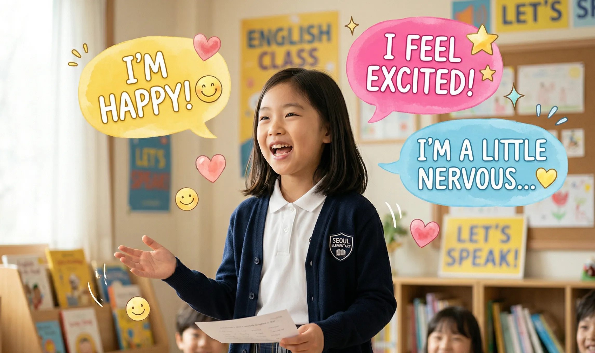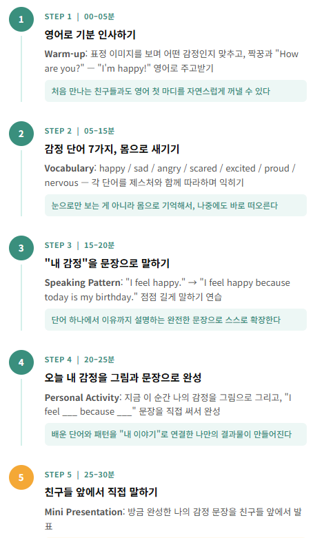 초등 필수 영단어를 통해 내 감정을 어휘로 표현해보는 수업입니다. 말하면서 단어를 익히고, 입도 트이는 진짜 영어를 경험해보세요!