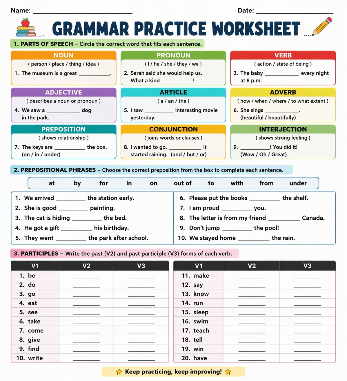 Words & Phrases → Reading Sentences → Grammar → Writing → Speaking