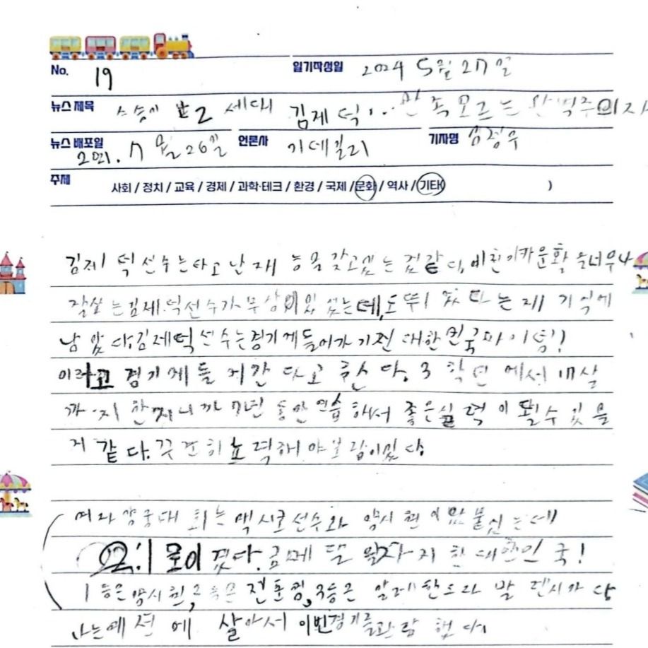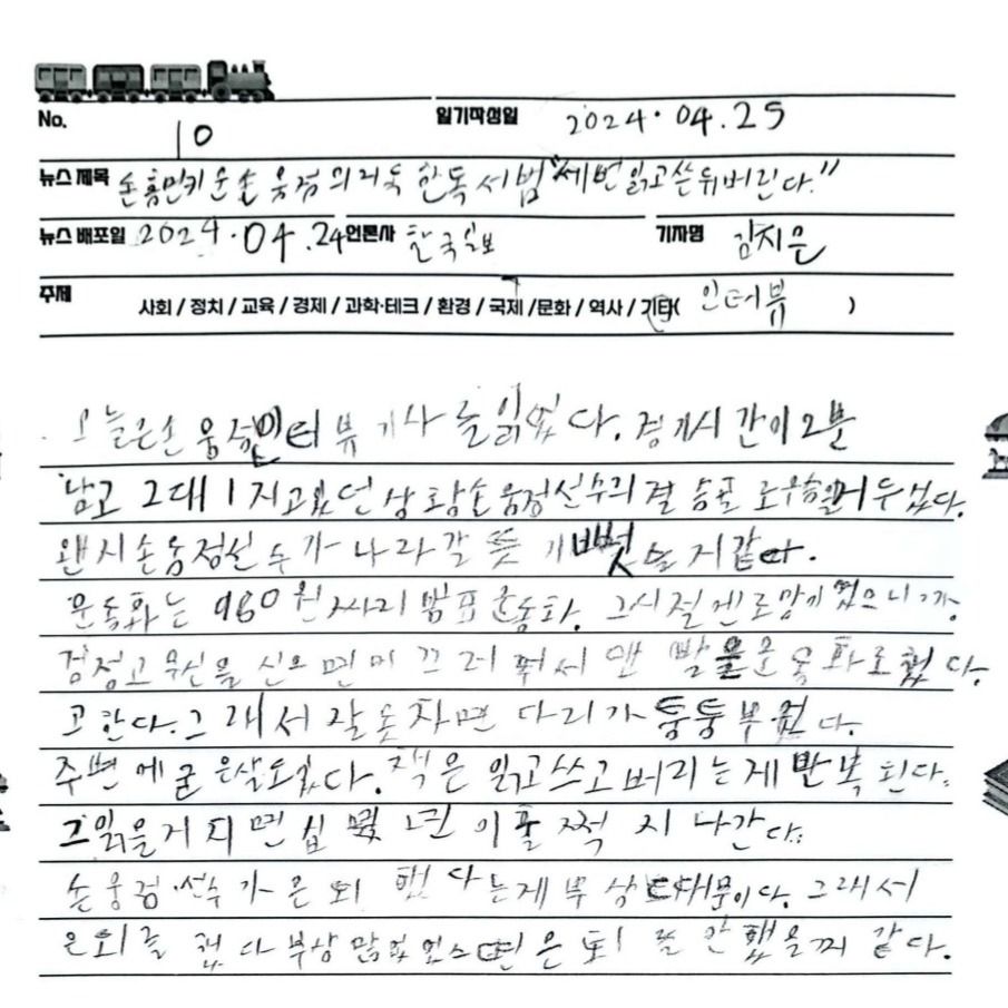 수업에서는 야구, 축구 등 다양한 스포츠 기사를 함께 읽습니다. 경기 결과 기사뿐 아니라 선수 인터뷰, 스포츠와 연결된 문화 이야기, 경제 기사까지 폭넓게 다룰 수 있습니다. 아이들은 기사를 읽으며 단순한 정보 확인을 넘어, “나는 어떻게 느꼈는지”, “어떤 점이 기억에 남았는지”, “이 기사를 보고 어떤 생각이 들었는지”를 자연스럽게 표현하게 됩니다.