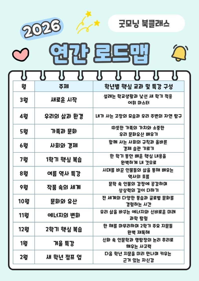 주먹구구식 읽기는 이제 그만! [굿모닝 북클래스]는 초등 교과 교육 과정을 완벽하게 분석하여 설계된 연간 로드맵을 따라갑니다. 국어와 고전부터 사회, 과학, 예술, 인문 등 그리고 뉴스 영역을 아우르는 지문으로 배경지식과 사고력을 동시에 잡습니다.