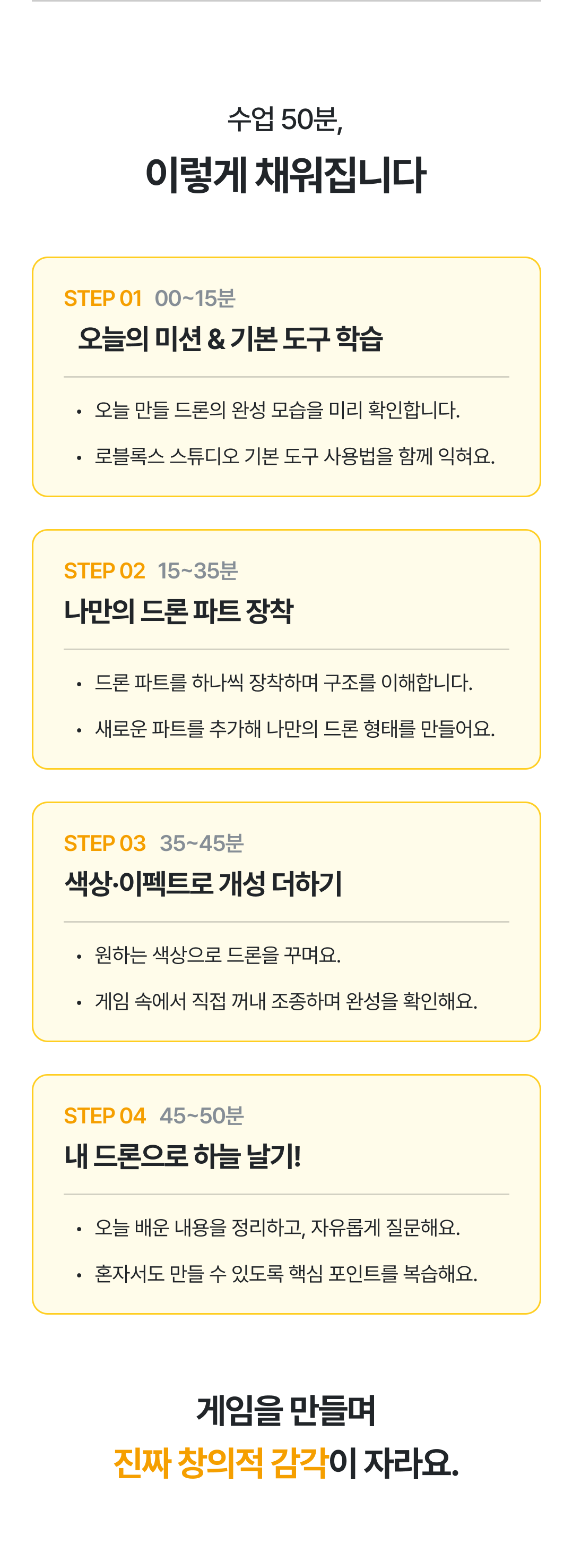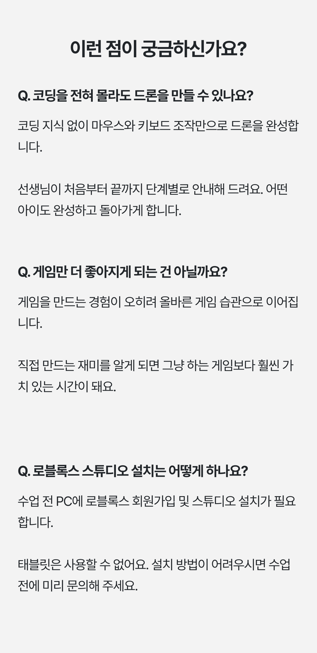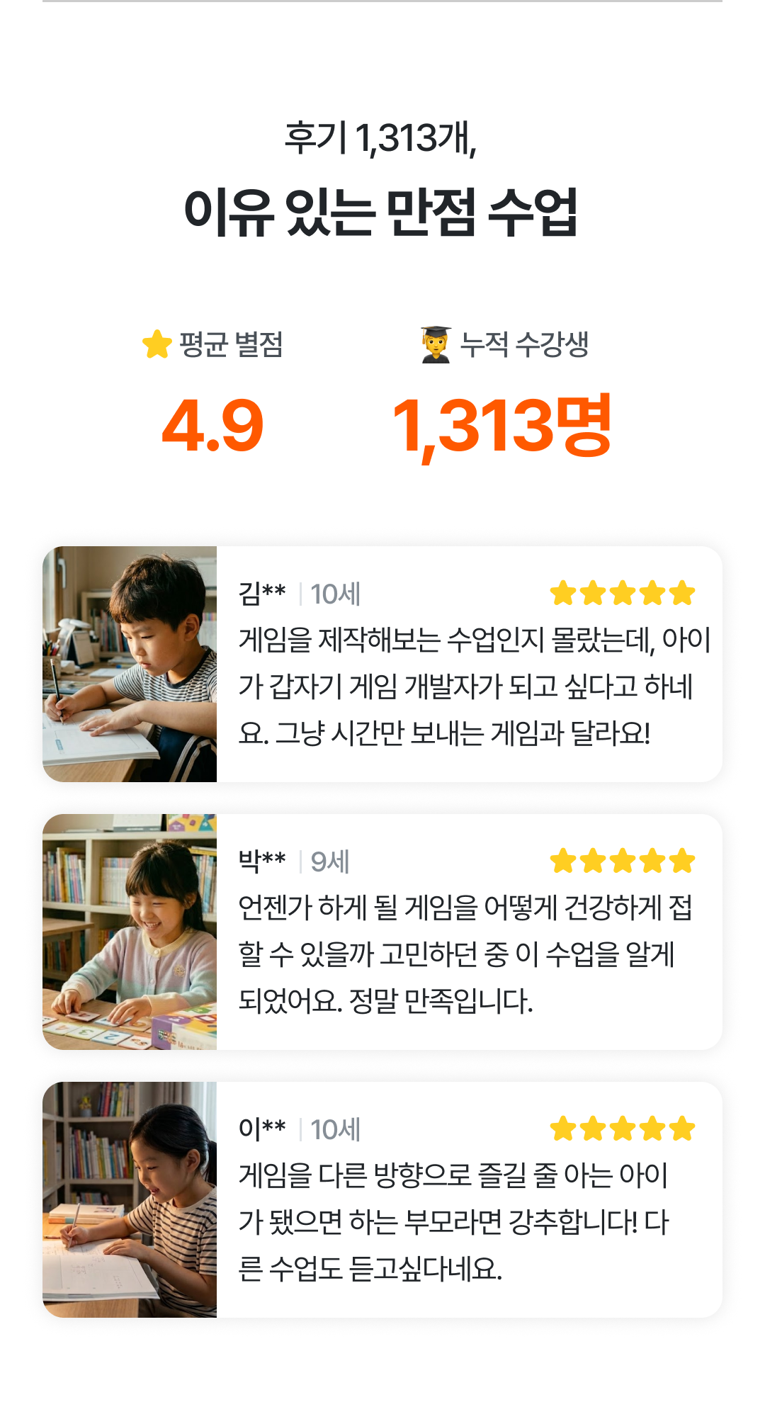 1. 구독자 300만 '흔한남매' 공식 게임 개발사 대표님에게 직접 배워요! 2. 복잡한 영어 코딩 NO! 간단한 마우스와 키보드 조작만으로 뚝딱! 3. 게임만 하던 아이가 '창의력','사고력','성취감'을 배우는 시간입니다.