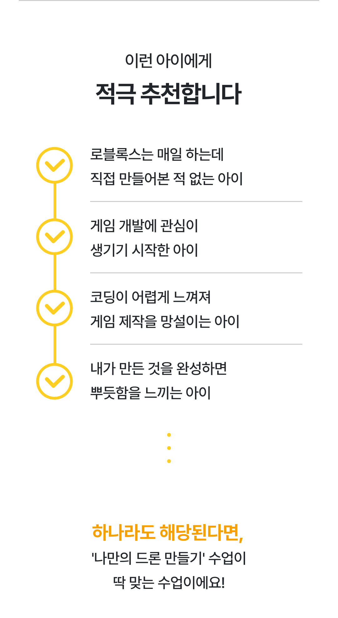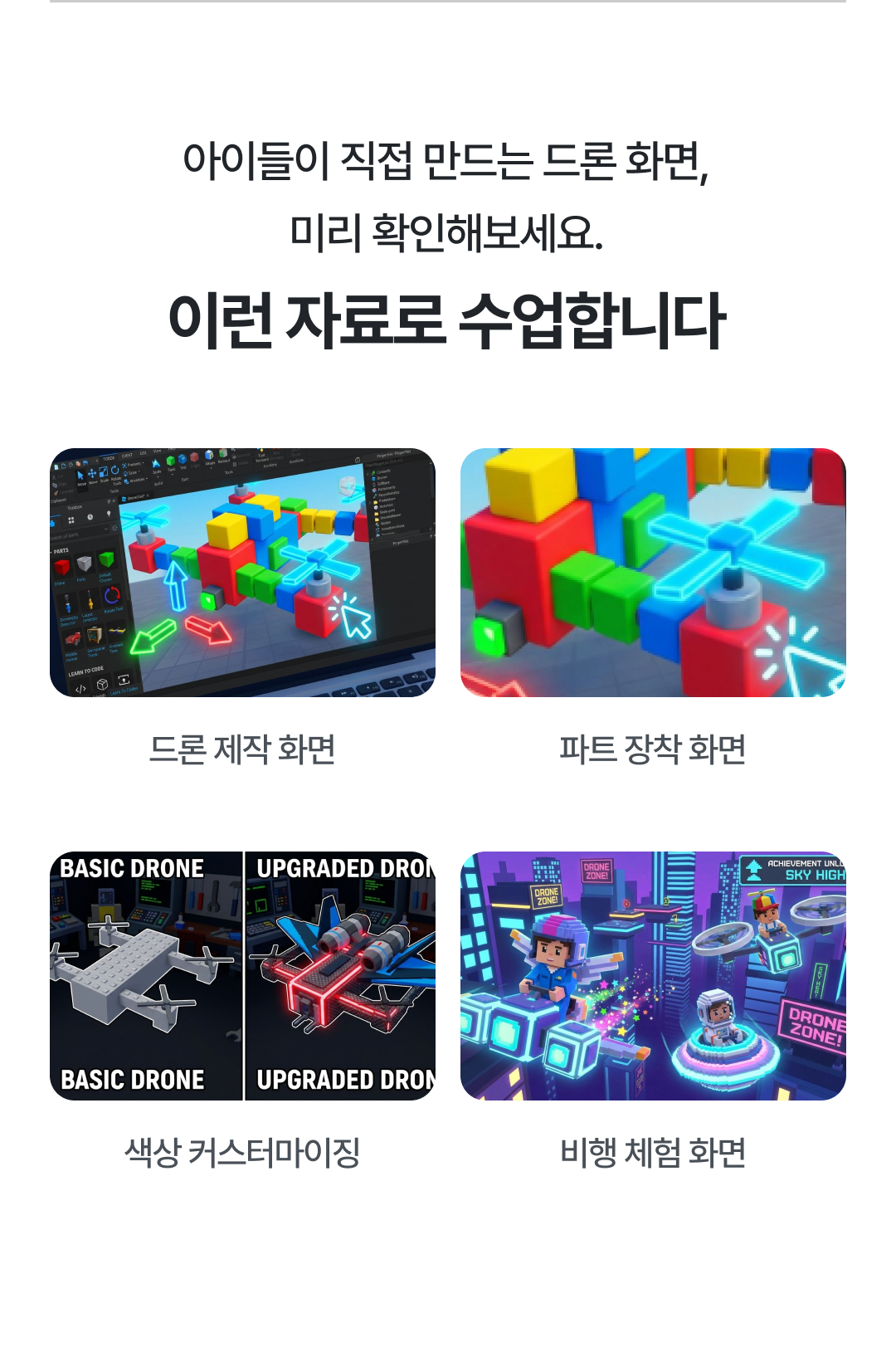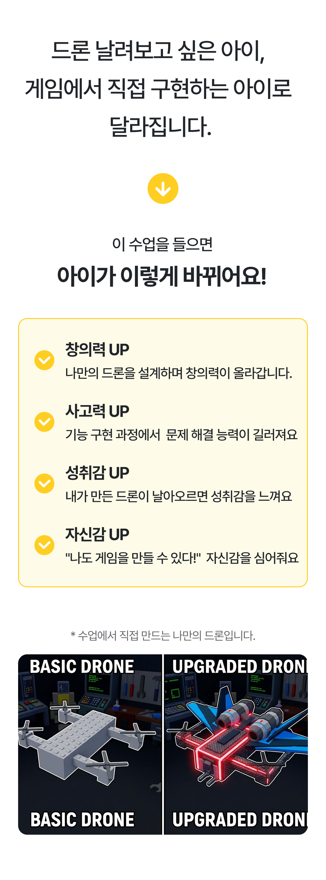 1. 구독자 300만 '흔한남매' 공식 게임 개발사 대표님에게 직접 배워요! 2. 복잡한 영어 코딩 NO! 간단한 마우스와 키보드 조작만으로 뚝딱! 3. 게임만 하던 아이가 '창의력','사고력','성취감'을 배우는 시간입니다.