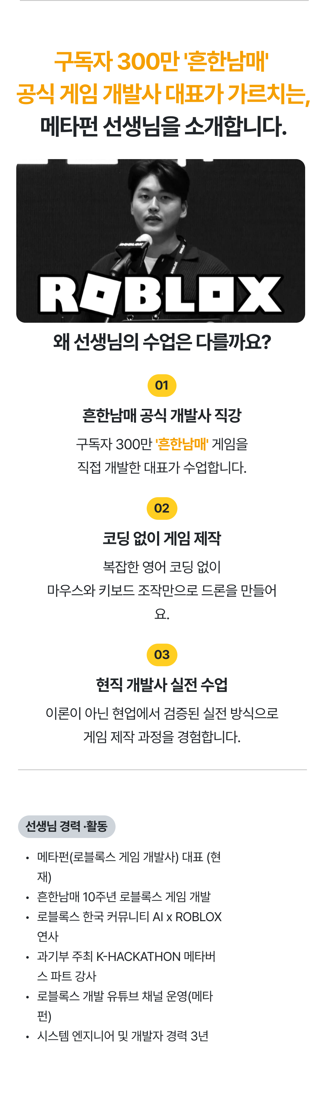 반가워요 친구들!! 🖐️ 선생님은 우리 친구들이 잘 알고 있는 로블록스에서 '메타펀'이란 이름으로 게임을 만들고 다양한 활동을 하고 있어요~ 메타펀 선생님이랑 같이 내가 만들고 싶은 게임을 만들고 친구들을 초대해서 같이 놀면서 자연스럽게 크리에이터, 개발자 활동을 경험해보고 싶은 친구라면, 망설이지 말고 메타펀 선생님이랑 같이 도전해봐요! 화이팅 🎆