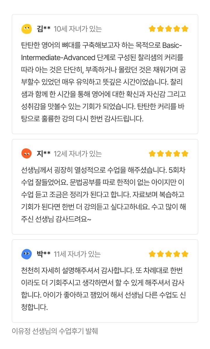🌈 영어학습 멘토 이유정(Charlie)입니다. 저는 미국 캘리포니아 주립대학교(California State University, Northridge)를 졸업하고, 미국 현지 병원에서 방사선사(Radiologic Technologist)로 근무한 글로벌 실무 경험을 갖춘 영어 교육 전문가입니다. 귀국 후에는 한국에서 어학원 원장으로 재직하며, 초등·중등 학생들을 대상으로 영어 전 영역(리딩·라이팅·문법·스피킹)을 체계적으로 지도하고 있습니다. 또한 생활 영어 및 라이팅 강의, 원어민 강사 채용 및 교육 매니징 등 교육 운영 전반을 아우르는 역할을 병행해 왔습니다. 💥수업 현장에서 많은 학생들이 문제 풀이에는 익숙하지만, 간단한 작문과 말하기에는 어려움을 느낀다는 공통적인 한계를 가지고 있음을 발견하였고, 이에 문법 개념을 ‘이해 중심’으로 정리한 뒤, 이를 라이팅과 말하기로 자연스럽게 연결하는 수업 방식을 핵심 교육 철학으로 삼고 있습니다. 🪐현재는 독해 · 라이팅 · 문법 통합 수업 TED 강연 및 네이티브 콘텐츠 기반 사고력 수업 생활 영어를 통한 실제 사용 중심 회화 수업을 통해, 영어를 ‘사고하고 표현하는 언어’로 익히도록 지도하는 영어 멘토로 학생들의 성장을 돕고 있습니다. 💕영어는 단기간의 성과보다 연속성, 꾸준함, 그리고 즐거움이 가장 중요한 언어입니다. <이유정 선생님의 수업 특징> 👉 학생 레벨에 맞춘 맞춤형 눈높이 수업 👉초·중등 라이팅과 자연스럽게 연결되는 이해 중심 문법 수업 👉 문해력을 키우는 레벨별 리딩 수업 (AR · Lexile 기반) 👉 중등 학교 내신 출제 경향을 반영한 핵심 포인트 수업 👉 TED 강연 · 네이티브 콘텐츠를 활용한 비판적·논리적 사고 수업 👉 초·중등 레벨 테스트를 통한 개인별 학습 로드맵 제시 (AR · Lexile · 내신 준비 방향 설정) 👉 예비고 대상 대입 컨설팅 및 진로 설계 방향 제시