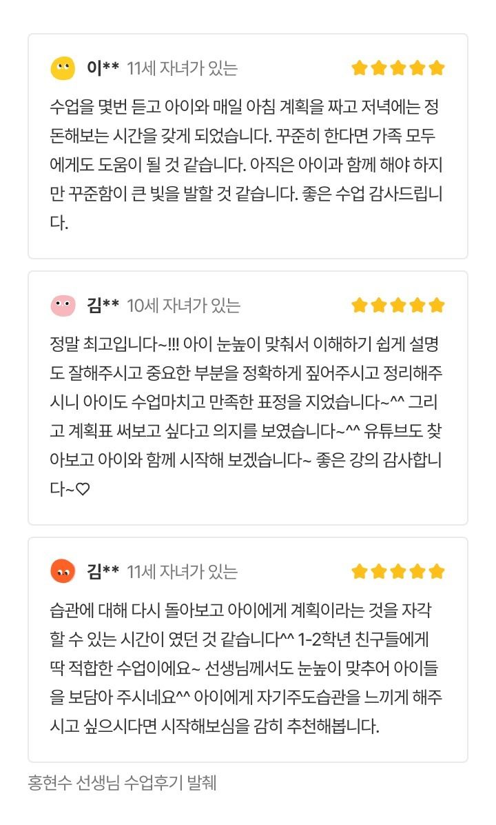 '분명 플래너가 좋은 건 아는데 왜 꾸준히 쓰지 못할까? 난 의지가 약한 걸까?' 아니요. 절대 아닙니다. 플래너 전문가 홍현수 작가! 단호하게 말씀드리겠습니다. '여러분은 문제없습니다. 다만, 제대로 된 방법을 못 배웠을 뿐입니다.' 우리는 국, 영, 수 선생님은 많이 만났지만, 플래너 선생님은 본 적이 없습니다. 플래너를 잘 활용하면 시간관리부터 학습, 공부의욕에 큰 도움을 받을 것 같은데 막상 쓰려고 하면 3일 이상 꾸준히 쓰기가 어렵습니다. 결국 어느 샌가 구석에 박힌 플래너를 볼 때가 많았죠. '플래너 쓰는 방법이 모두 같을 필요는 없잖아? 다양한 사람만큼 플래너도 다양하게 쓰는 방법이 있는 게 아닐까?' 이것이 고민의 시작이었습니다. 제 강의들은 플래너를 통해 아이들을 관찰하고, 맞춤방법을 제안하여, '자기주도적 습관'을 키워 주는 것이 목적입니다. 그리고 그것이 반드시 학습에만 국한되진 않습니다. 무엇이든 자기 주도적 습관만 갖춘다면 일가를 이룰 수 있기 때문이죠. 그래서 '공부만 잘하는 아이'보단 '공부도 잘 하는 아이'를 지향합니다. 최근 아이를 더 체계적으로 관찰하기 위해 MBTI와 에니어그램 검사자격을 취득했고요 전문성을 더 높이고자 '한국교원대학교 대학원'에 진학 석사학위 취득 후 박사과정 중입니다. 플래너는 플래너를 쓸 줄 아는 사람에게 배워야 합니다. 단순히 시간이 표시된 양식지에 쓴다고 술술 써지지 않거든요. 많은 시행착오와 자신에 대한 고민, 달성하지 못한 계획의 원인과 개선을 끊임 없이 고민하는 가운데 서서히 향상되는 게 플래닝 능력입니다. 그래서 습관화가 관건이었습니다. '잘 쓰냐, 이쁘게 쓰냐'가 중요한 게 아니라 '썼냐, 안 썼냐'가 훨씬 중요하더라고요. 아이와 함께 하는 코치의 자세로서, 열정과 진심을 다해 지도하겠습니다.
