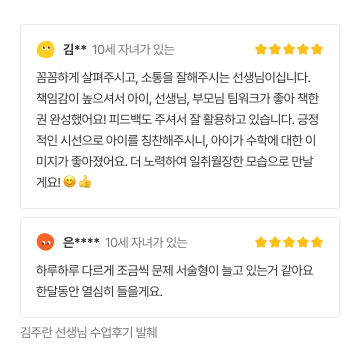 안녕하세요. 저는 김주란선생님이에요! 꾸그 친구들을 만나게 되어 정말 기뻐요^^ 선생님은 중고등학교 언니, 형, 누나들이랑 주로 공부를 많이 했어요. 그러면서 수학 공부를 힘들어하는 친구들을 많이 보게 되었어요! 친구들에게 도움 될 수 있는 방법을 고민하게 되었고, 처음 중학교 올라와서 힘들어 하는 과정들을 초등학교에서 배운 내용과 연계해서 중3 과정까지 연결되는 과정을 기획하게 되었어요 :) 단순한 연산 연습만 하는 것이 아니라 배경지식 그리고 연관된 놀이와 창의력 수업으로 연결하려고 해요. 선생님도 준비하면서 기대되고 고민도 많이 했답니다~ 선생님과 클래스를 함께하면서 성장할 친구들, 꼭 만나요! ^^
