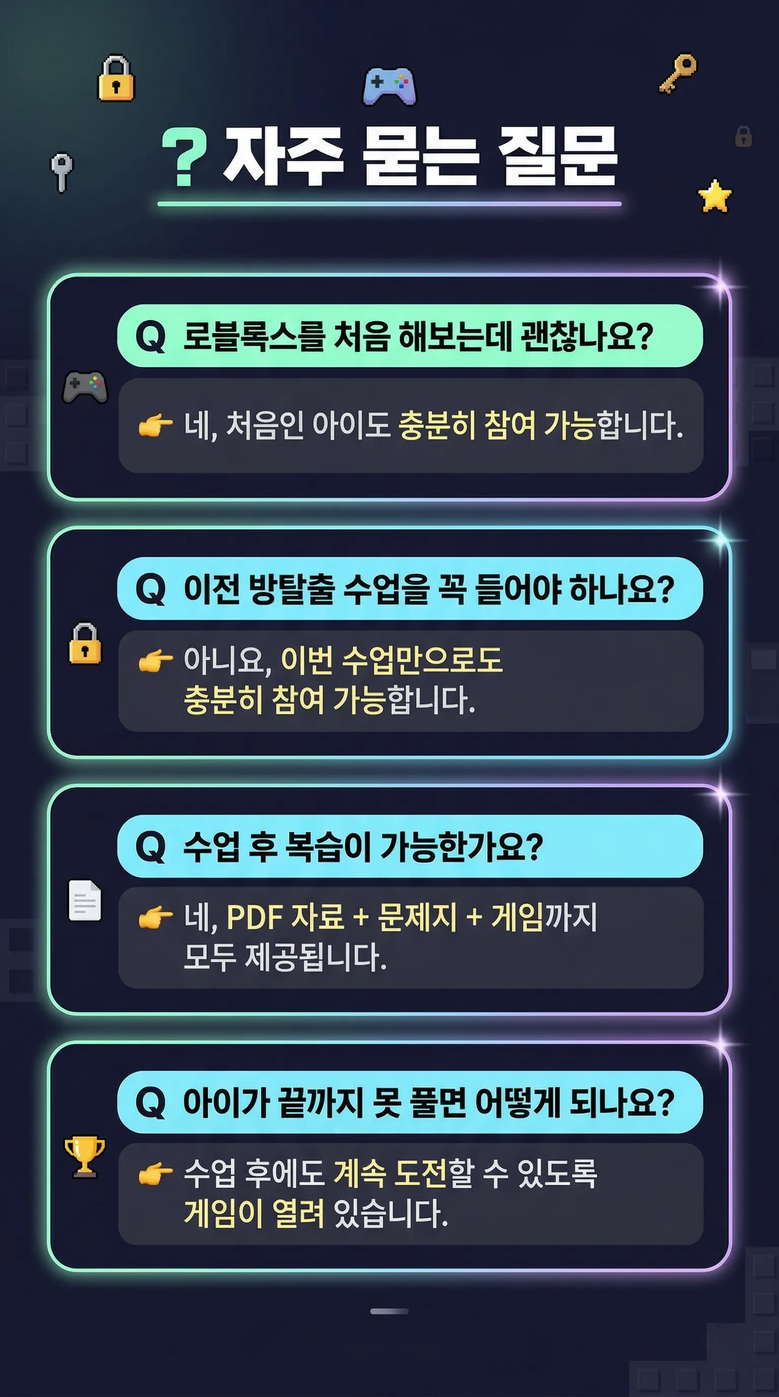 로블록스로 방탈출 게임을 하며, 배운 개념을 직접 활용해 문제를 풀어갈 수 있어요.