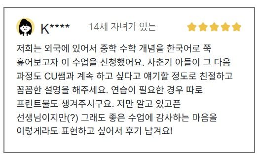 중등수학 전문! 수포자 구원의 아이콘! Cu쌤이 꾸그에 왔어요! 수학 때문에 고민인 학생과 학부모님이라면 반드시 꼭 끝까지 꼼꼼하게 읽어주세요! 2016년부터 화상과외 수학을 가르쳐오고 있는 수학전문 강사 Cu쌤입니다! 그동안 아이가 수학이 어려워해서 싫어해서 고생하신 부모님들 많으시죠? 그렇다고 수학을 포기할 수도 없구요. 수학 공부를 시켜야 하는 부모님과 수학을 극구 거부하는 아이 사이에 갈등도 많으셨을 겁니다. Cu쌤은 그런 친구들 전문입니다. 수학이 어렵다 못해 두려워 하던 친구들은 Cu쌤을 만나고 수학이 쉽고 재밌다고 합니다. 왜일까요? Cu쌤은 다정다감하게 수업을 진행하며, 개념 하나하나 이해하기 쉽게, 이해가 될 때까지 설명해줍니다. 수학이 두려워 어디 질문하는거까지 두려워 하던 친구들이 이런 점을 좋아합니다! Cu쌤은 이해 못한다고 윽박지르거나 아이들의 자존감을 깍지 않습니다. 수학을 못한다고 혼나고 윽박 당한 경험들이 수학을 두려워하고 멀리하는 이유가 되기도 합니다. 다정다감 친절보스 재미있는 수학을 함께하는 Cu쌤입니다. Cu쌤은 화상과외의 장점을 살려서 전국 각지의 친구들은 물론 해외에 있는 주재원 자녀분들과도 수학 수업을 진행해오고 있습니다(일본, 중국, 홍콩, 인도, 베트남, 두바이, 미국 등) 한 번 수업을 시작하면 1년 이상 오랫동안 수업을 진행하는 친구들이 대다수입니다. 수년간의 화상과외 노하우로 대면과외 못지 않은 수업을 진행해오고 있기 때문이죠! Cu쌤은 중등수학 전문입니다. 중등수학이 탄탄해야 고등수학도 어렵지 않게 해나갈 수 있습니다. 초중등때 만나서 고등과정까지 마무리 한 친구들이 다수입니다. 그만큼 학생들과 학부모님들의 신뢰를 많이 받고 있기 때문이죠! 수학을 무서워하고 두려워하고 싫어하던 아이가 수학을 이해하면서 스스로 문제를 풀면서 수학의 즐거움을 깨달아가는 그 과정을 Cu쌤과 함께하세요! 😁