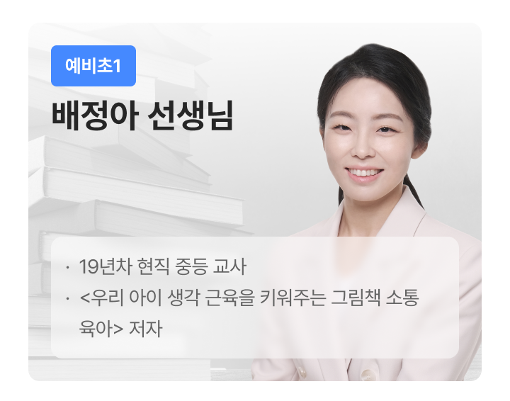 안녕하세요. 배정아입니다. 저는 예비 초 딸 아이를 키우는 엄마이자, 19년 차 현직 중등 교사입니다. 오랜 기간 학교 현장에서 5,000명이 넘는 학생들을 가르치면서 대입에 성공하는 아이들의 특징에 관심을 기울였습니다. 제가 발견한 공통점은 부모의 교육열이나 유명 입시 학원의 수업이 아닌, 바로 꾸준히 책을 읽으며 지식과 주관을 다져나가는 독서 습관이었습니다. 또 그 뒤에는 어린 시절부터 꾸준히 책을 읽어주고, 다양한 주제의 책 대화를 나눠주는 부모님의 수고가 있음을 알게 되었습니다. 19년 간 교직 생활의 경험을 바탕으로 5년 간 꾸준히 딸 아이와 엄마표 학습과 더불어 '매일 독서와 책 대화'를 이어오고 있습니다. 또 그림책 큐레이터, 그림책 심리지도사, 책놀이 지도사 등 관련한 자격증을 공부하고, 자녀 독서 교육서를 출간하며 전문성에 깊이를 더하였습니다. 아이가 책을 안 읽어서 걱정인 분! 책은 많이 읽는데 문해력이 떨어져 고민인 분! 교과서를 여러 번 읽어도 뜻을 모르는 아이 때문에 한숨 짓는 분! 정말 많으실 거예요. 그 고민을 모두 모아 독서 강의 및 챌린지를 기획하였습니다. 제가 지난 5년간 딸 아이와 함께하며 겪었던 놀라운 변화와 150명의 초등 학부모님이 몸소 체험한 기적을 함께 느껴보시길 바랍니다.
