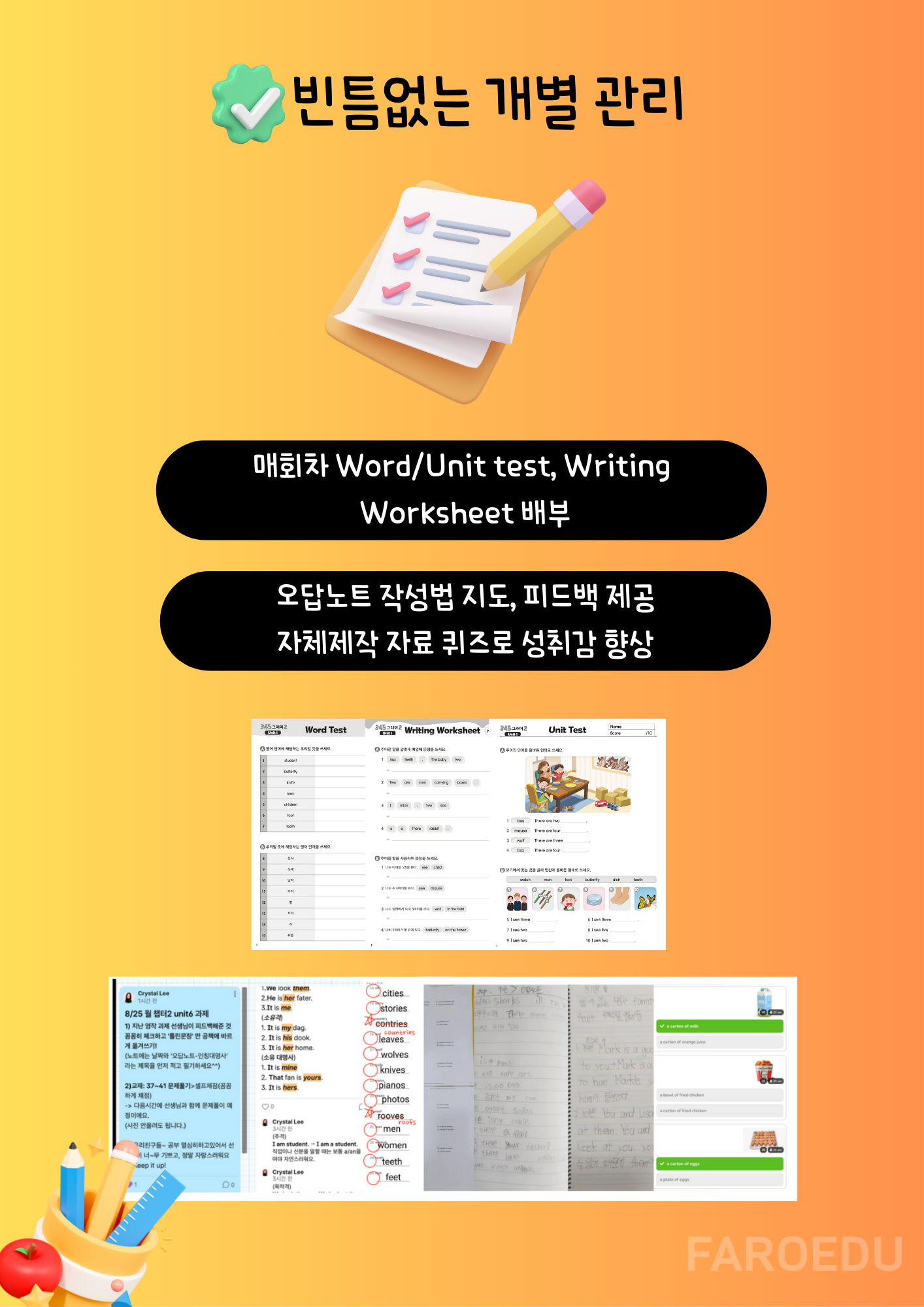 문법 학습은 시작이 가장 중요합니다. 초등 저학년 학습자의 눈높이에 맞춘 직관적이고 쉬운 커리큘럼을 통해 문법을 자연스럽게 이해하고 기초 문법을 실제 의사소통에 적용할 수 있는 기본 능력을 길러줍니다. 또한 <매 회차마다 단원별 워드·문법 테스트를 과제로 제공하여 학습 내용을 꾸준히 복습하고 잊지 않도록 지도>합니다.
