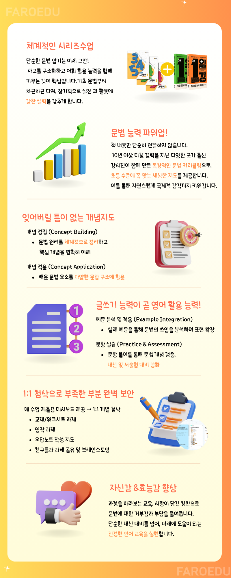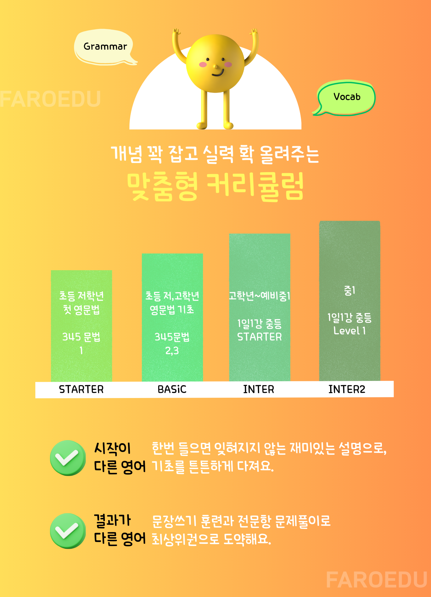 문법을 '단어의 형태'로 시작하여 기초부터 체계적으로 학습하는 수업입니다. 어휘(읽기, 철자), 파닉스, 문장구조의 기초를 튼튼히 다져 라이팅을 기반을 세우며, 문법 학습의 기초 과정을 준비하는 완벽한 입문 도약 과정입니다.