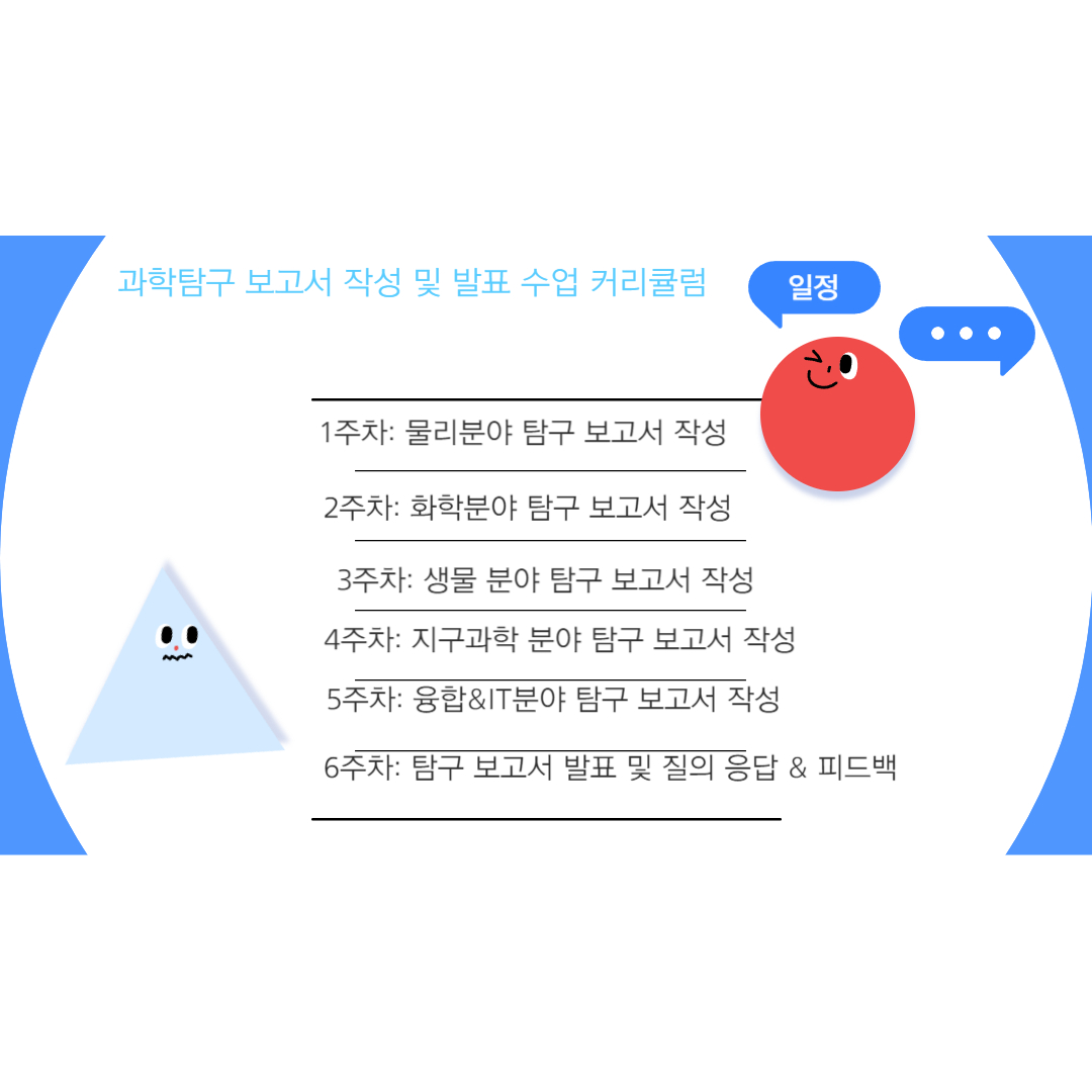 초등 및 중등 교과과정 속, 물리, 화학, 생물, 지구과학, 융합&it분야별로 탐구 과제를 정하고 관련 영상을 본 후, 자료 탐색을 한 후 탐구 보고서 작성 및 발표를 하는 수업입니다.